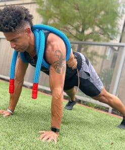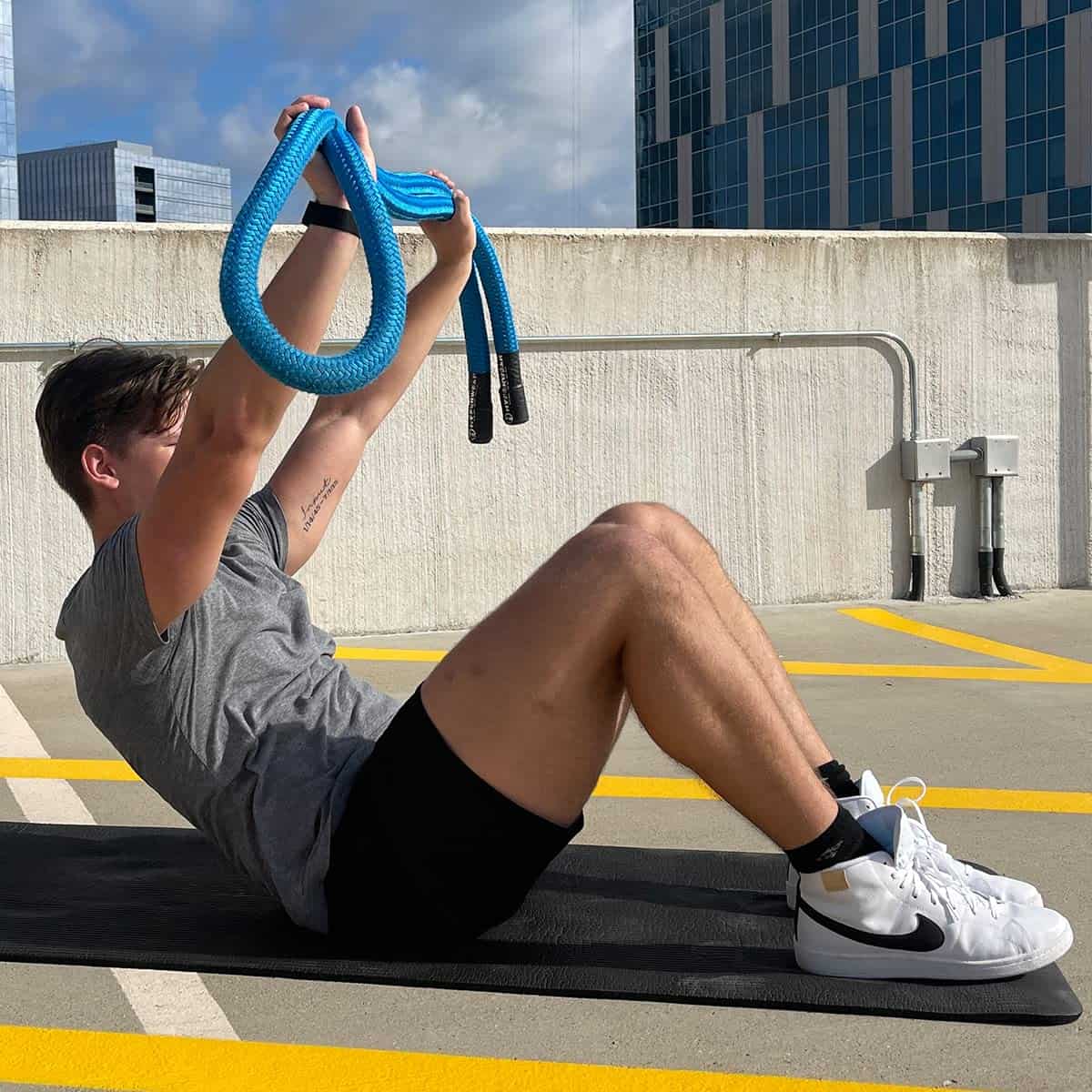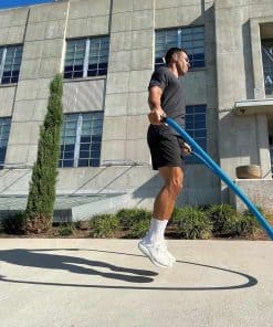 2. QUALITY WORTH THE PRICE- Beautifully braided electric blue pure polyester workout rope 9′ 9″ long. Will not unwind and shed fibers like cheap twisted construction Dacron blend weighted rope. Our shorter 4 inch handle length is much easier on the wrists and made possible by a special reinforcement of the exercise rope ends. Part of the patented Hyper Rope gym rope family of heavy rope workout equipment.