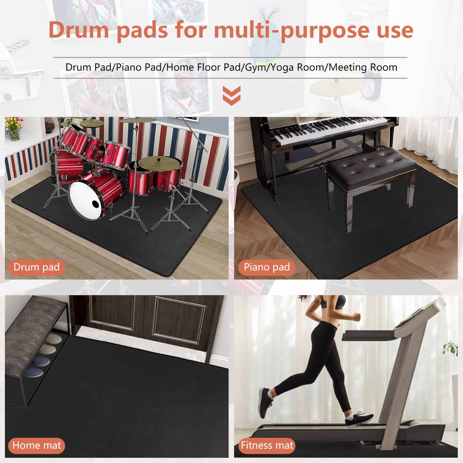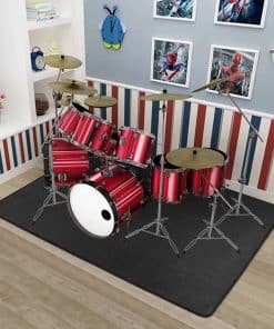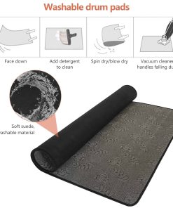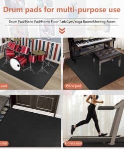 IBVIVIC Tapete de Tambor 4 pies x 5.2 pies, Tela Tejida Resistente con Base Antideslizante, Rollo de 21.2 Pies Cuadrados, Negro. La base de goma antideslizante bien hecha garantiza estabilidad para toda su configuración mientras está posicionada en superficies duras. Tejido de alta calidad con puntos de látex antideslizante puro. Tapete de tambor antideslizante profesional, adecuado para práctica y presentaciones musicales. Tamaño del tapete de tambor: 47.23» x 63» (120×160 CM), la mayoría de las configuraciones de tambores encontrarán mucho espacio en la parte superior de este tapete de tambor, lo que facilita mover todo el conjunto cuando sea necesario. Este tapete de tambor es duradero y está hecho con tela tejida gruesa que proporciona gran estabilidad. Con cierta función de absorción de sonido y protege su piso de daños causados por el kit de batería o los pedales. Nuestro tapete de tambor encaja perfectamente debajo de tambores electrónicos, soportes de tambores, pianos, cintas de correr y más. Ya sea para su estudio de música, apartamento o actuaciones al aire libre, este tapete de tambor puede satisfacer fácilmente sus necesidades. Debido al empaque plegado, los tapetes de tambor pueden tener algunas arrugas al recibirlos, puede usar una plancha para mantener los tapetes de tambor planos. Consejos Cálidos: Debido al empaque plegado, el tapete de tambor que recibió puede tener algunas arrugas, puede usar una plancha para deshacerlas y así obtendrá un tapete de tambor plano y liso. Además, este tapete de tambor profesional a prueba de humedad / insonorizado es fácil de limpiar y se puede lavar a máquina, solo use detergente de lavandería común.