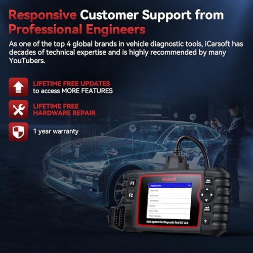 8. Sin Tarifa Adicional y Fácil de Usar: Sin tarifa de suscripción, sin tarifa de actualización. Ofrecemos ACTUALIZACIÓN GRATUITA DE SOFTWARE DE POR VIDA, REPARACIÓN GRATUITA DE HARDWARE DE POR VIDA y garantía de 1 año. Trabaje directamente, no es necesario descargar ningún software. Diagnóstico automático en profundidad para todos los componentes para identificar todas las fallas y potenciales fallas. No es necesario solucionar problemas uno por uno. iCarsoft es una de las 4 mejores marcas globales en herramientas de diagnóstico de vehículos, con décadas de experiencia técnica y es altamente recomendada por muchos Youtubers.