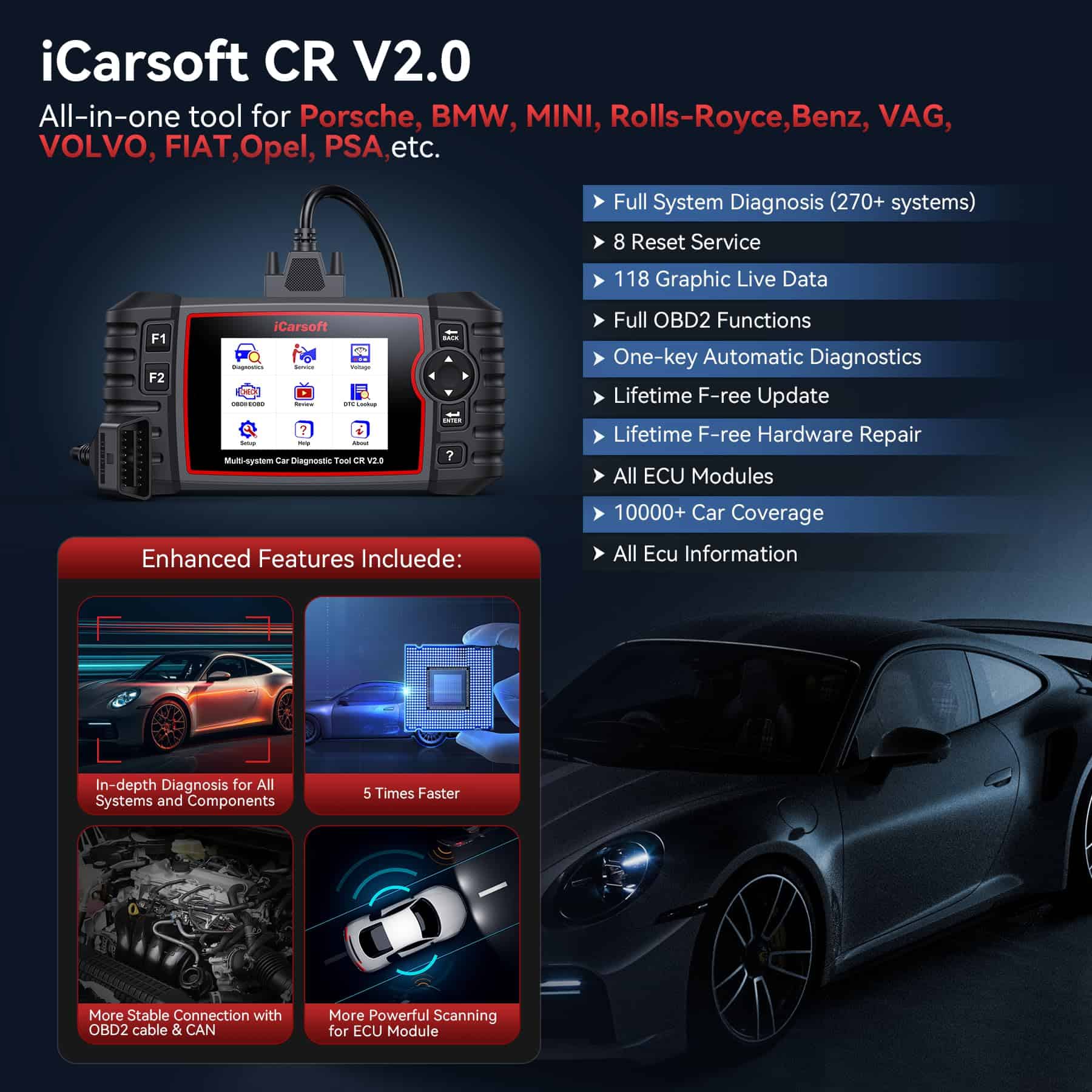 iCarsoft CR V2.0 Escáner OBD2 para Porsche/BMW/VAG/Volvo,