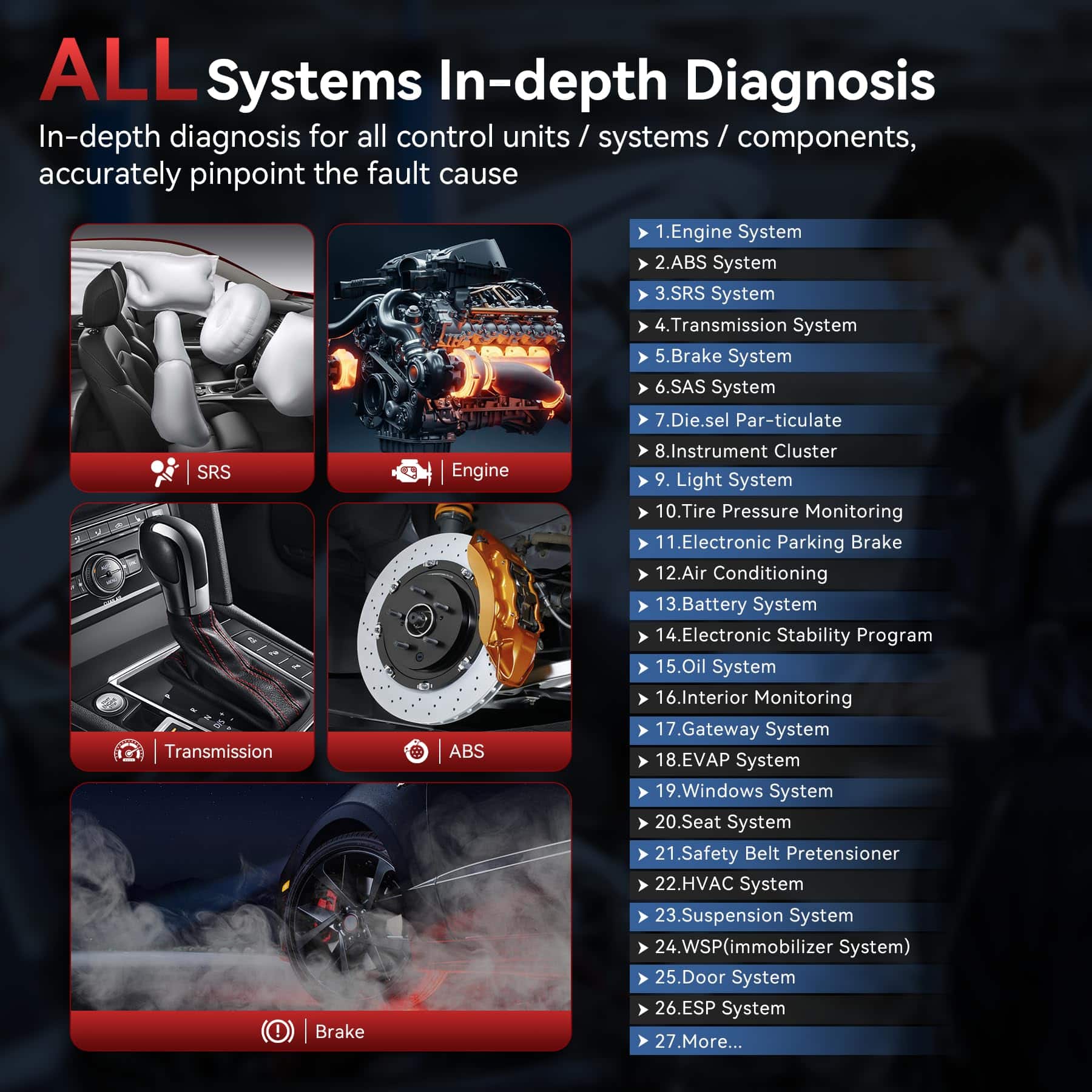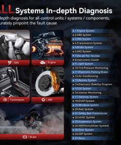 7. AVISO IMPORTANTE: Debido a las diferencias en los protocolos y sistemas/ECUs únicos a través de modelos de vehículos, no todos los servicios/sistemas listados están disponibles. Contáctenos para confirmar la compatibilidad con funciones específicas antes de la compra o visite nuestro sitio web para más detalles.