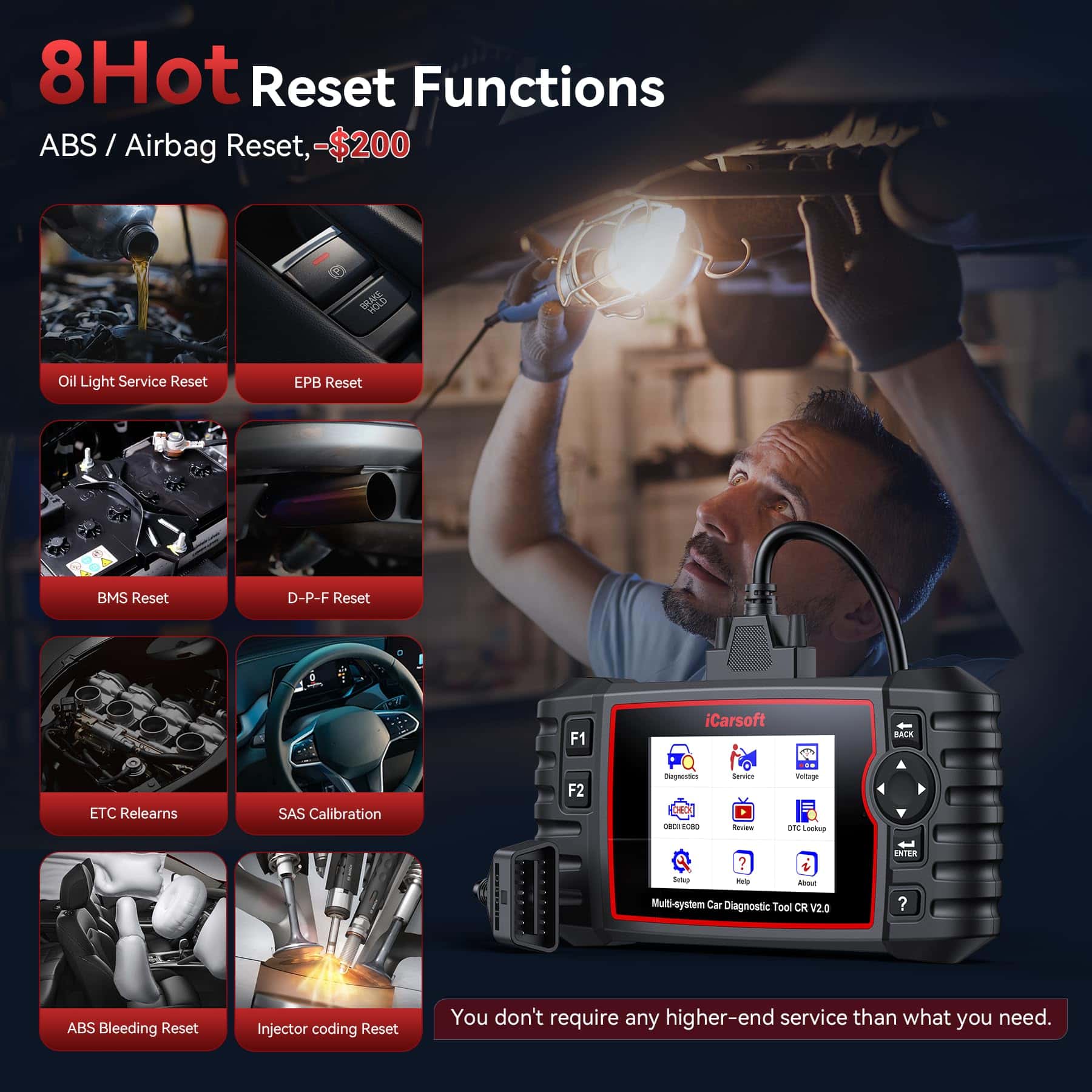 4. Servicios de Reinicio Completos: El lector de códigos iCarsoft ofrece servicios de reinicio esenciales a un precio más económico en comparación con otros escáneres (50-140 $) que carecen de capacidades de reinicio. Incluye servicios como reinicio de aceite, reinicio de EPB, registro de batería, reinicio de DPF, reajustes de ETC, calibración de SAS, sangrado de ABS y codificación de inyectores, ahorrando tanto tiempo de reparación como costos de mantenimiento. (Nota: Los servicios disponibles dependen de los ECUs del sistema de su vehículo. Contáctenos para verificar la compatibilidad).