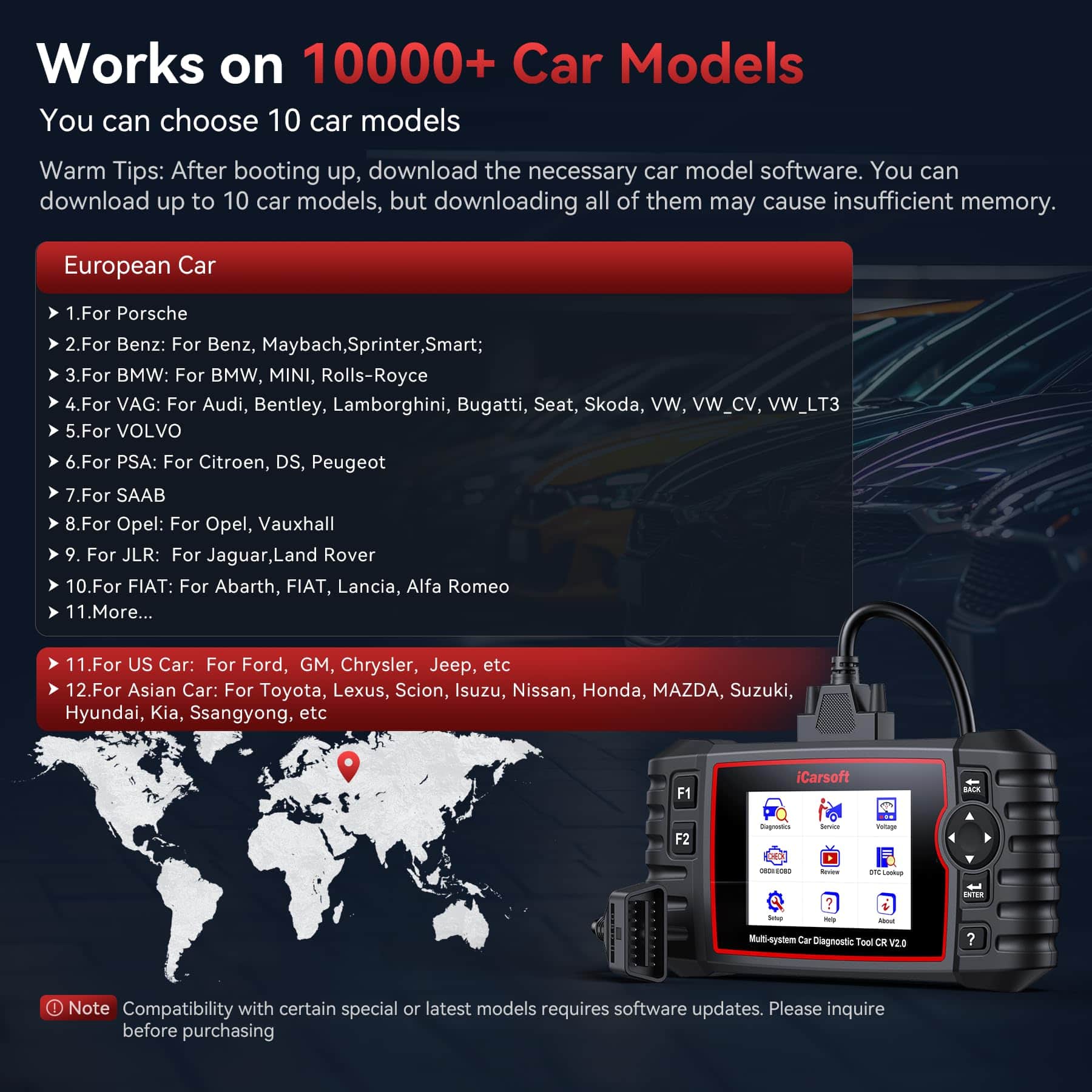 1. IMPORTANTE: Tenga en cuenta que al usar el producto por primera vez, el escáner puede aparecer en blanco ya que no tiene software preinstalado. Deberá descargar el software de la marca de automóvil deseada sin costo adicional. Si no sabe cómo descargar el software o necesita ayuda, no dude en contactarnos. iCarsoft ofrece un escáner OBD2 personalizable, que le permite seleccionar solo las marcas de automóviles que necesita, ahorrándole el pago de software innecesario.