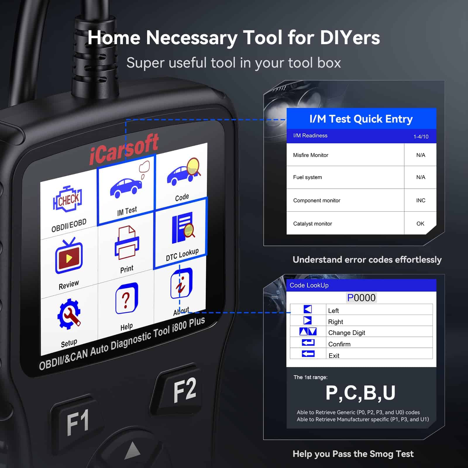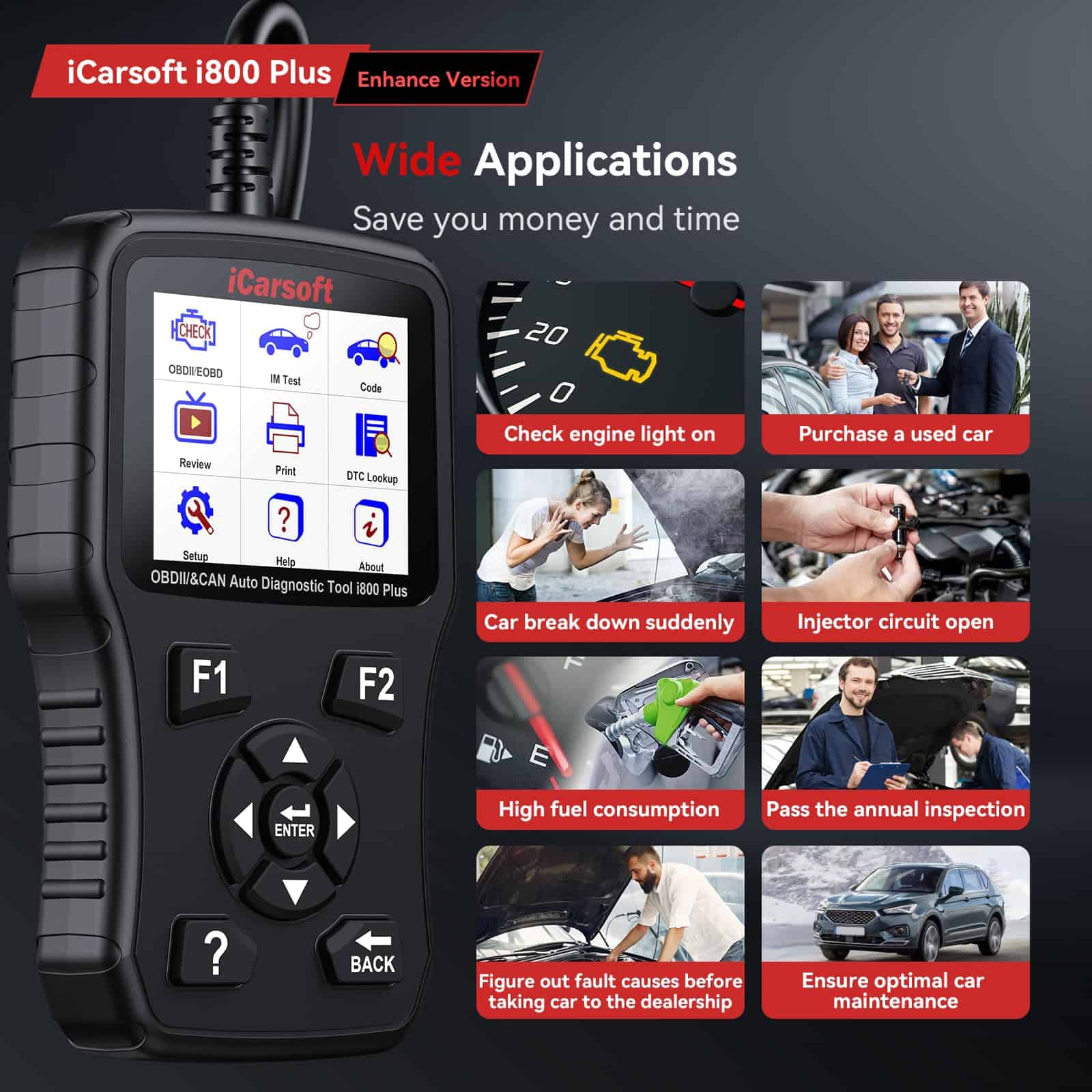 2. FUNCIONES OBD2 POTENTES: iCarsoft i800 Plus es una herramienta de diagnóstico versátil, como leer y borrar códigos, diagnósticos profundos para el motor, prueba de batería, apaga la luz del motor (MIL) y restablece los monitores, 87 datos en vivo, I/M Readiness, foto congelada, prueba de sensor de O2, VIN, CVN, biblioteca de códigos DTC, pruebas de monitoreo a bordo para componentes/sistemas específicos, prueba del sistema evap, guarda y revisa los resultados de las pruebas que pueden ser cargados en la PC e impresos. Estas pruebas te ayudan a corregir problemas relacionados con la eficiencia del combustible y las emisiones de vehículos.