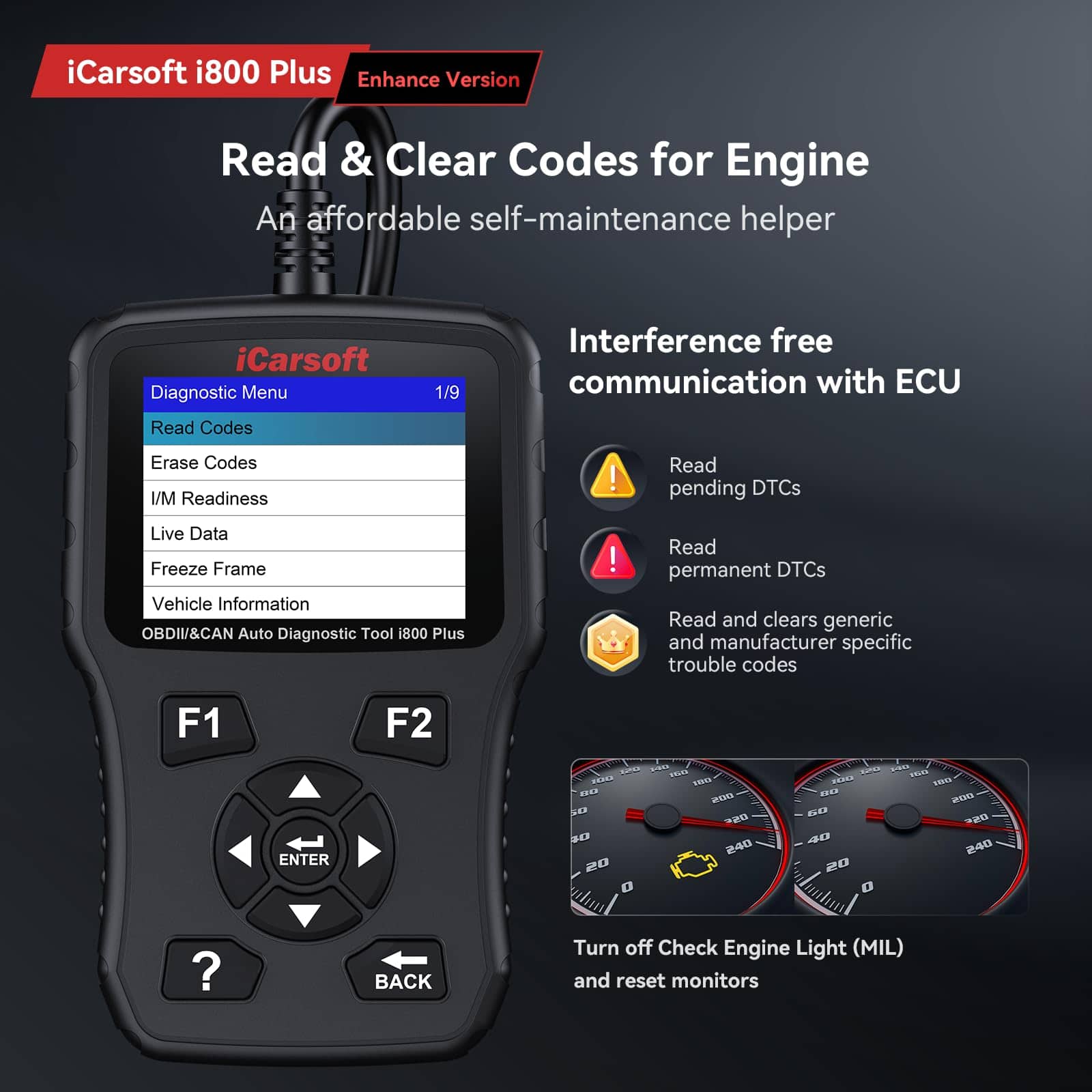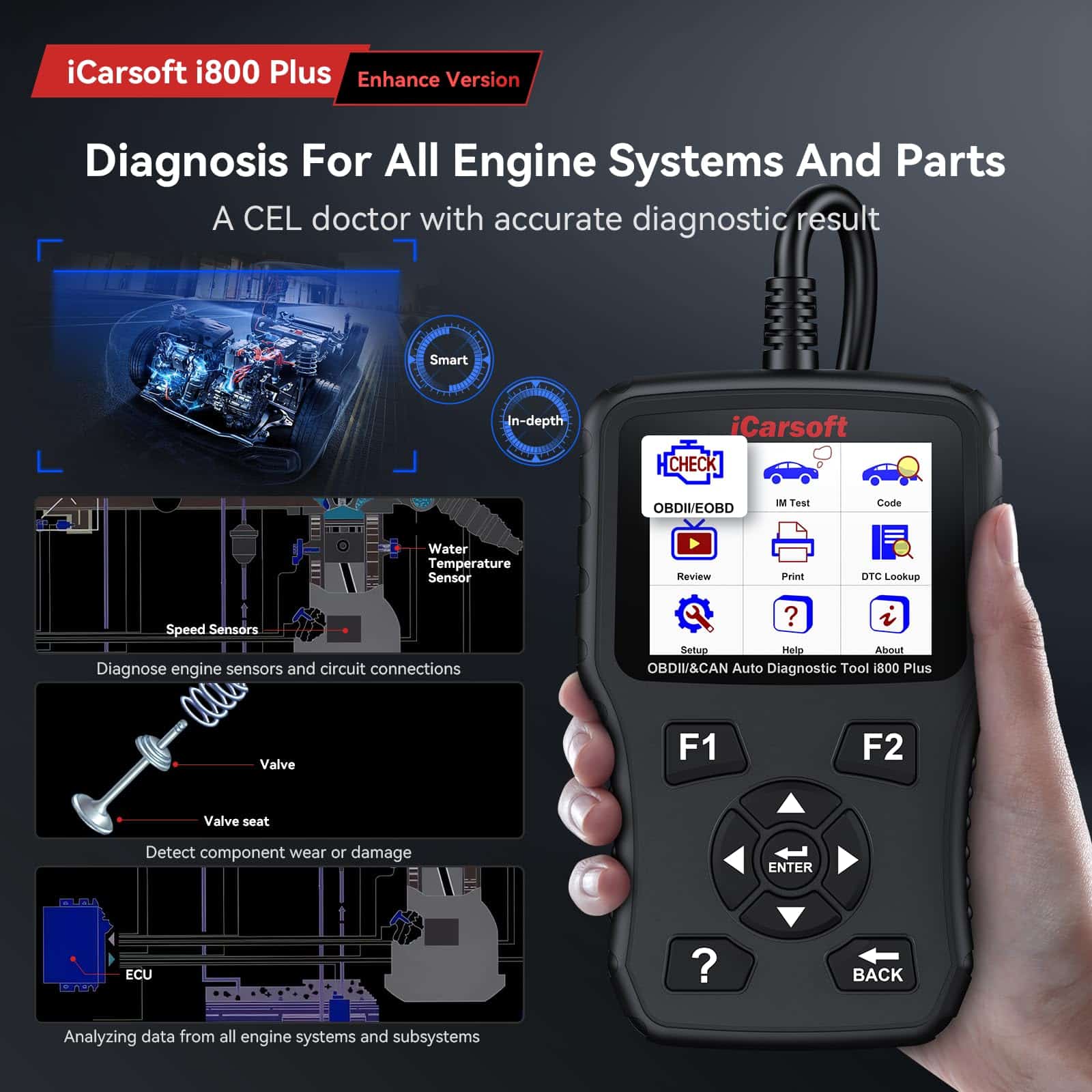 1. CEL DOCTOR: El escáner de coche iCarsoft escanea de manera integral todas las partes del motor, diagnosticando con precisión problemas de motor y ofreciendo consejos de reparación informativos. Ayuda a apagar la luz del motor (check engine light)MIL y restablecer el monitor y puede ser utilizado para la prueba de conducción y el pre-diagnóstico de posibles problemas del motor detectando conexiones de sensores y circuitos, desgaste o daño de componentes, y analizando datos de inyectores de combustible y sistemas de ignición, gracias a sus sensores de alta precisión, componentes electrónicos.