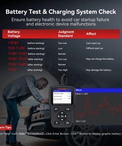 4. COMPROBACIÓN DEL SISTEMA DE CARGA DE BATERÍA: La herramienta de escaneo te permite monitorear fácilmente la salud de la batería de un vistazo mostrando detalladamente el voltaje de la batería en un gráfico dinámico. Determina rápidamente la suficiencia de la batería y el estado de funcionamiento del sistema de carga. Un voltaje de batería demasiado alto o demasiado bajo indica un problema potencial con el sistema de carga. Este lector de códigos es útil para prevenir fallas de arranque del vehículo u otros problemas eléctricos causados por una falla de la batería, ahorrándote tiempo y costos de reparación.