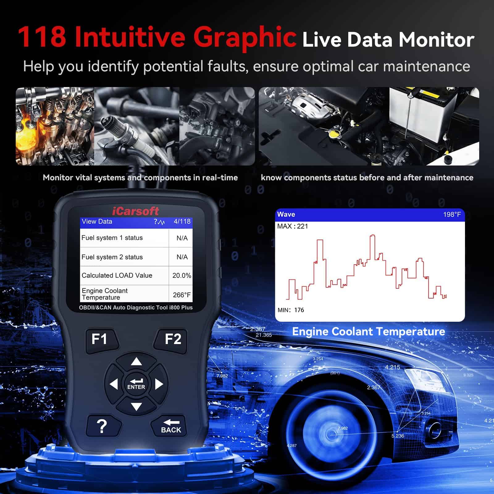 3. MONITOR DE 118 DATOS EN VIVO: Puedes acceder a 118 datos en vivo para monitorear sistemas y componentes vitales de tu auto en tiempo real, como la velocidad del motor/voltaje de la bobina de encendido/temperatura de la transmisión/presión del aceite/temperatura del refrigerante/recorte de combustible a corto plazo, etc. Esto te permite identificar posibles fallas y revisar la salud del auto a fondo en casa, para conocer el estado de los componentes antes y después del mantenimiento. Los datos en vivo también pueden ayudarte a solucionar problemas rápidamente, útil para el auto-mantenimiento. Auto seguro, conducción segura.