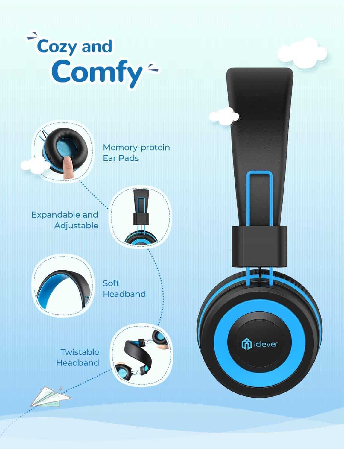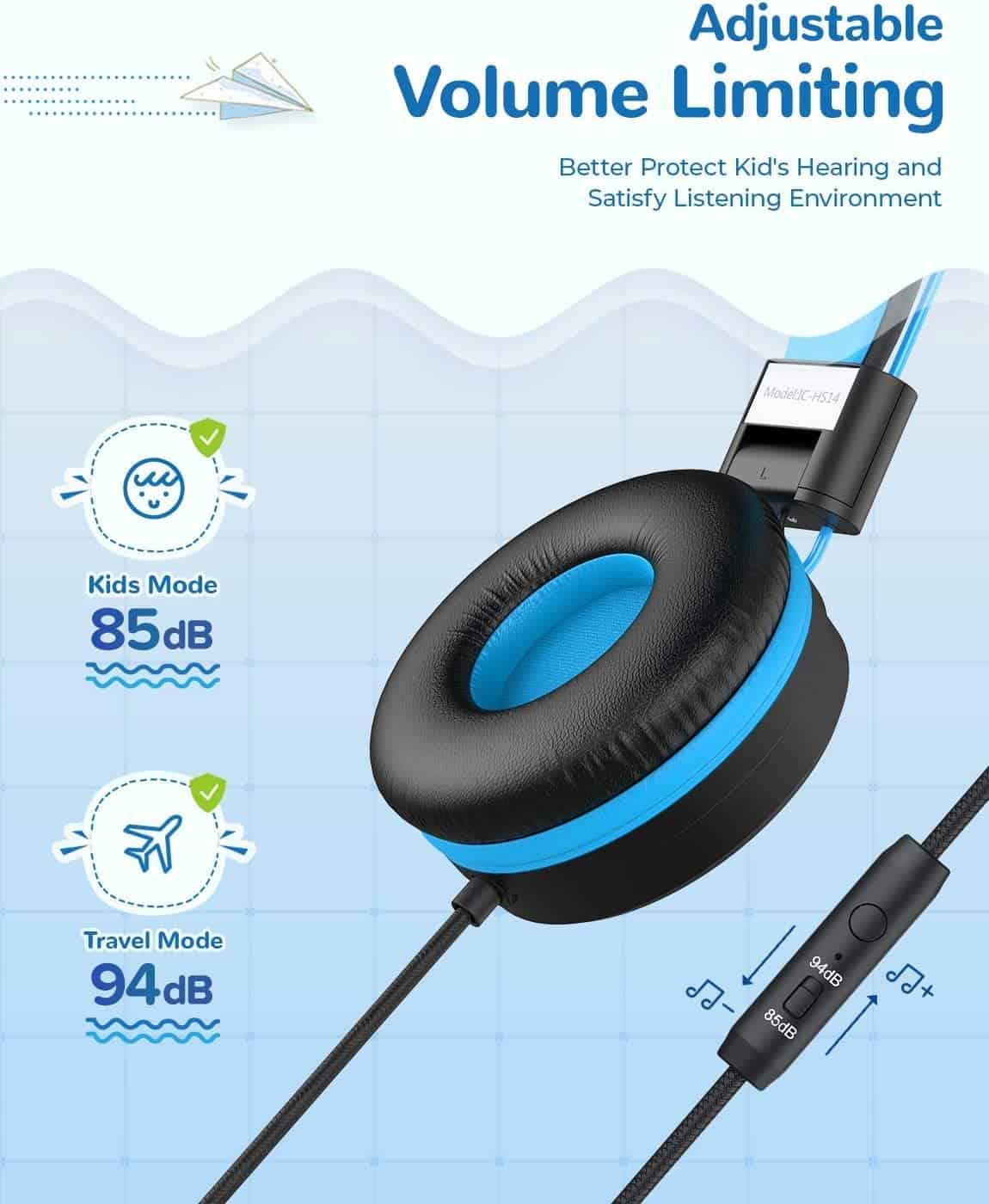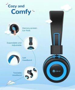 1. Control de Volumen Seguro para Niños – La seguridad de tu hijo es nuestra prioridad. Los audífonos para niños de iClever limitan el nivel de volumen a 85 dB para una escucha segura. El volumen puede ajustarse a 94 dB para sonidos claros en entornos ruidosos.