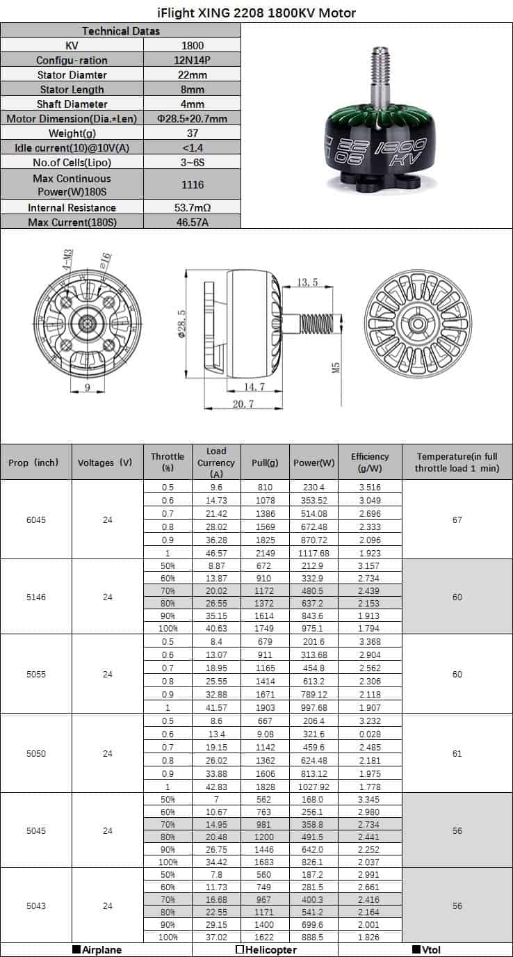iFlight 4pcs XING 2208 1800KV Motor Brushless 6S para QAV FPV Racing Drone Quadcopter es un conjunto de 4 Motores Brushless de alta calidad que ofrecen una potencia y empuje increíbles en un diseño robusto y ligero. Este motor XING de la serie iFlight es compatible con 6S y cuenta con un eje de aleación de titanio de 4 mm y imanes de alta calidad N52H, rodeados por devanados resistentes a altas temperaturas. Los motores utilizan un patrón de montaje estándar M3 de 16 mm x 16 mm en la parte inferior, con una longitud de cable de 160 mm para adaptarse a diferentes marcos y configuraciones. Además, cuentan con un diseño antideslizante en la superficie de contacto con la hélice para aumentar la fricción y mejorar la durabilidad, así como múltiples orificios de disipación de calor para mantener una temperatura óptima. Cada motor ha sido equilibrado dinámicamente y cuenta con un cojinete de amortiguación resistente a aplastamientos para eliminar eficazmente la vibración durante el vuelo.