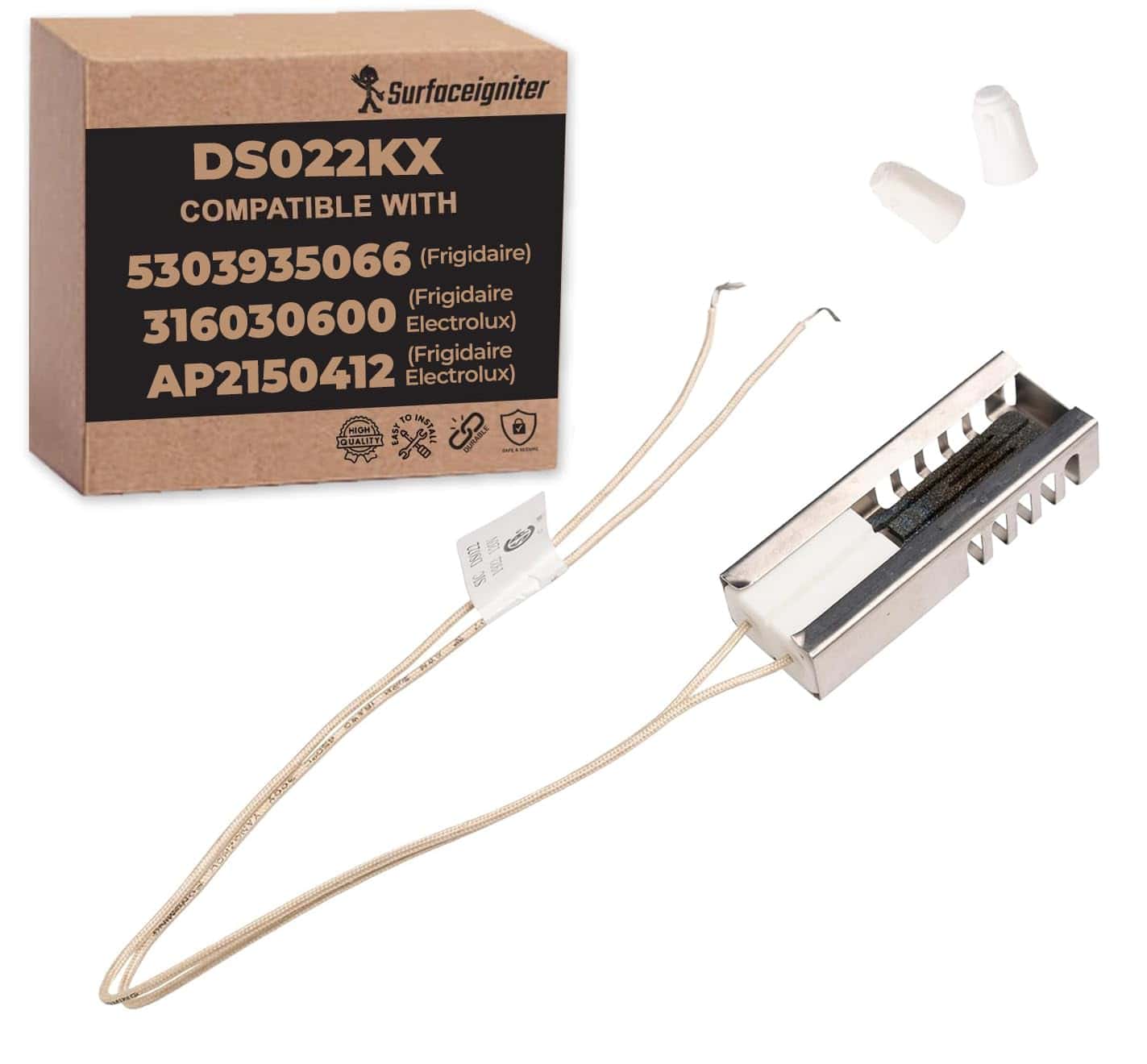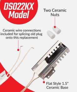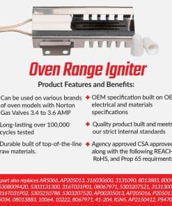 El Ignitor para horno DS022KX de reemplazo OEM está diseñado para cumplir con los mismos materiales y especificaciones requeridos por el OEM, asegurando un reemplazo preciso para su horno. Este ignitor para horno de gas está aprobado por CSA y cumple con las regulaciones RoHS y Reach, priorizando normas de seguridad y regulación. El DS022KX reemplaza una amplia gama de números de parte, incluyendo 5303935066, 5303307577, 530800942, y muchos más, garantizando compatibilidad con varios modelos de horno. Con cables de plomo de 17″ y un bloque cerámico de 1-1/2″, este ignitor plano para horno incluye cables pelados y tuercas de cerámica para una conexión de empalme sin complicaciones durante la instalación. Antes de iniciar la reparación, siempre desconecte la fuente de alimentación del horno y cierre el suministro de gas para garantizar la seguridad.