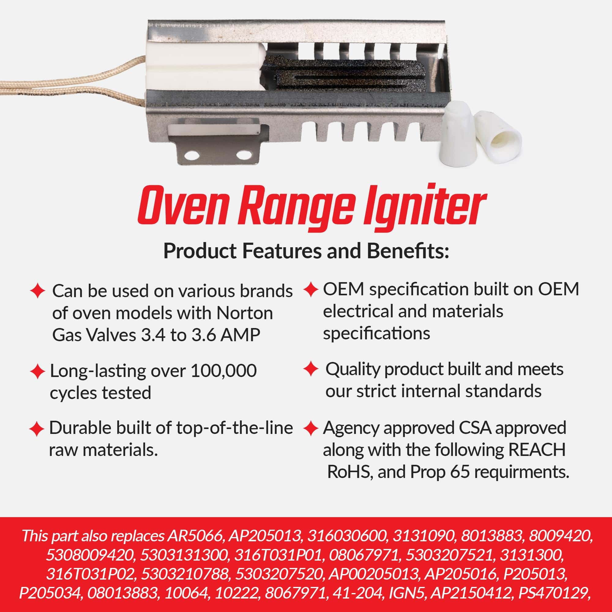 4. Instalación conveniente: Con cables de plomo de 17″ y un bloque cerámico de 1-1/2″, este ignitor plano para horno incluye cables pelados y tuercas de cerámica para una conexión de empalme sin complicaciones durante la instalación.