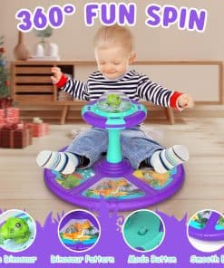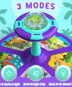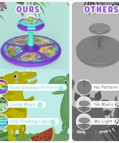 Nuestro juguete de silla giratoria de dinosaurio está equipado con música melodiosa e innovadoras luces LED. La armoniosa combinación de sonido y luz cautiva a los niños pequeños, estimulando su imaginación. Cada ritmo, cada melodía, pinta su mundo con un espectro de colores, ofreciendo un deleite sensorial en la fusión de música y luz.