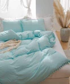 IHOUSTRIY Juego de Funda de Edredón para Niños Tamaño Twin,100% Microfibra Lavada de 2 Piezas Juego de Funda de Edredón, Borlas de Pompones de Color Sólido Suave y Transpirable con Cierre de Cremallera y Lazos para Esquinas. El juego de funda de edredón para niños IHOUSTRIY está diseñado para brindar comodidad y estilo a cualquier habitación. Disponible en varios colores, este juego de funda de edredón viene en tamaños Twin, Full, Queen y King para adaptarse a sus necesidades. La microfibra lavada es suave al tacto y ligera, lo que garantiza una sensación de lujo en su piel. Certificado por Oeko-tex Standard 100, puede estar seguro de que los textiles cumplen con altos estándares de seguridad y medioambientales. La funda de edredón presenta un diseño de borlas de pompones lindo y elegante, con borlas en 3 lados y fundas de almohada con borlas en 4 lados. Tanto las fundas de edredón como las fundas de almohada son reversibles y tienen el mismo patrón en ambos lados, lo que le brinda versatilidad en la decoración de su habitación. El cierre de cremallera en la abertura de la funda de edredón hace que sea conveniente poner y sacar el edredón, y los 4 lazos de esquina aseguran que el edredón se mantenga en su lugar durante la noche. Las fundas de almohada tienen una apertura en la parte trasera para facilitar el cambio de almohadas. Para garantizar la durabilidad de las borlas de pompones, se recomienda utilizar una bolsa de lavandería o dar la vuelta al revés al lavar el juego de sábanas. Lavar a máquina en frío en un ciclo suave, sin blanqueador, secar a baja temperatura o al aire, y no es necesario planchar a menos que se desee. Con el juego de funda de edredón para niños IHOUSTRIY, puede disfrutar de comodidad asequible y elegancia todos los días en su dormitorio, habitación de invitados o habitación de niños.