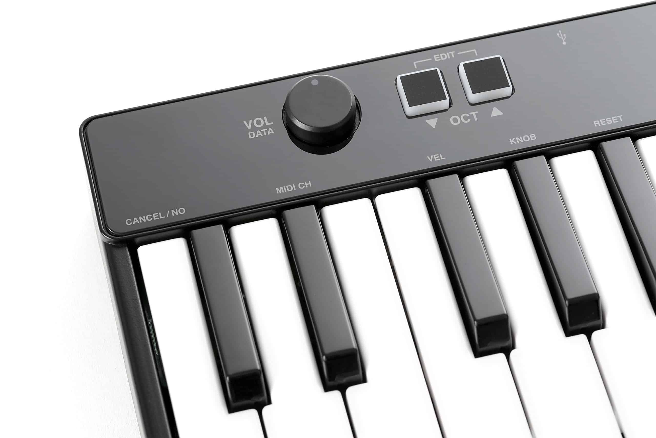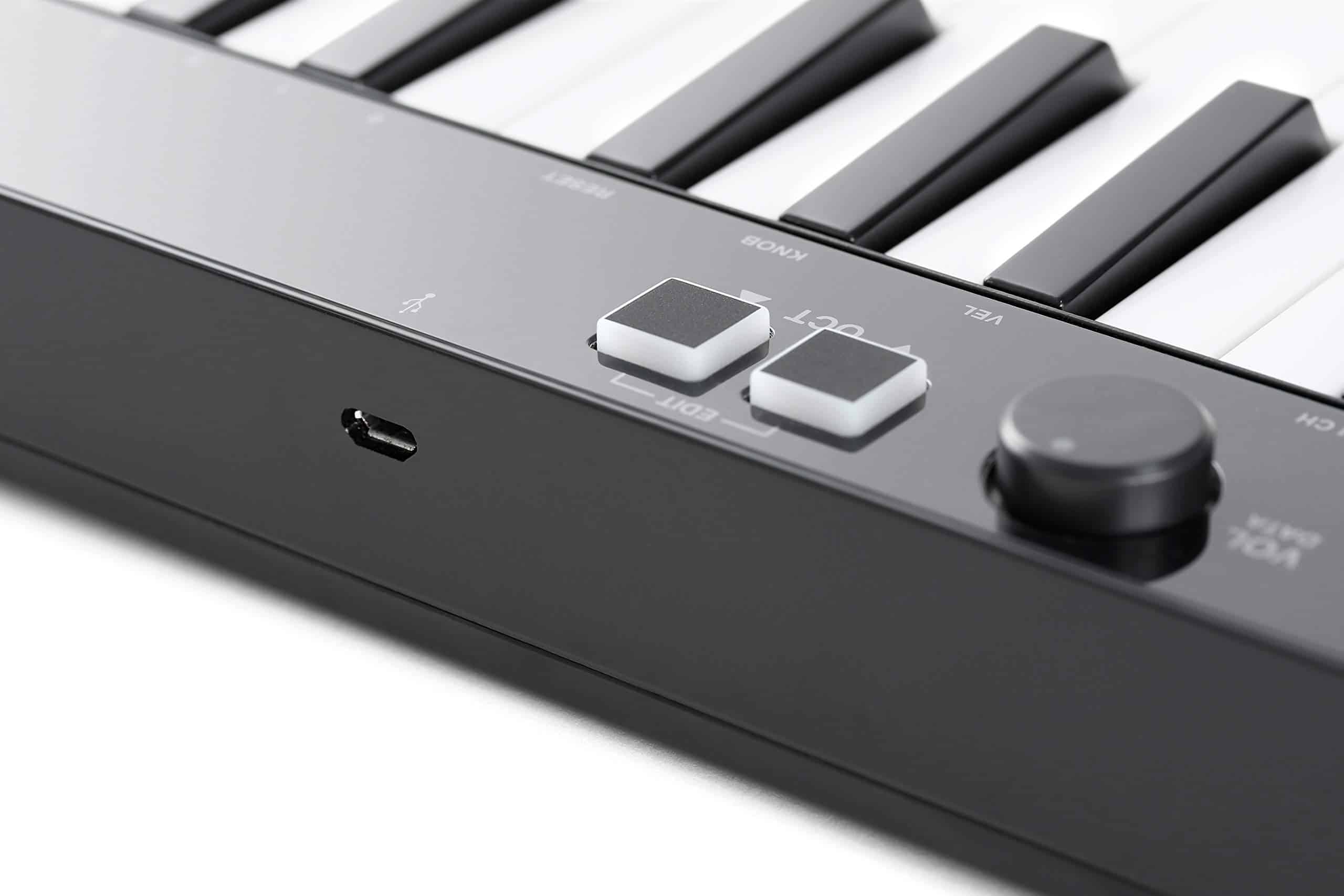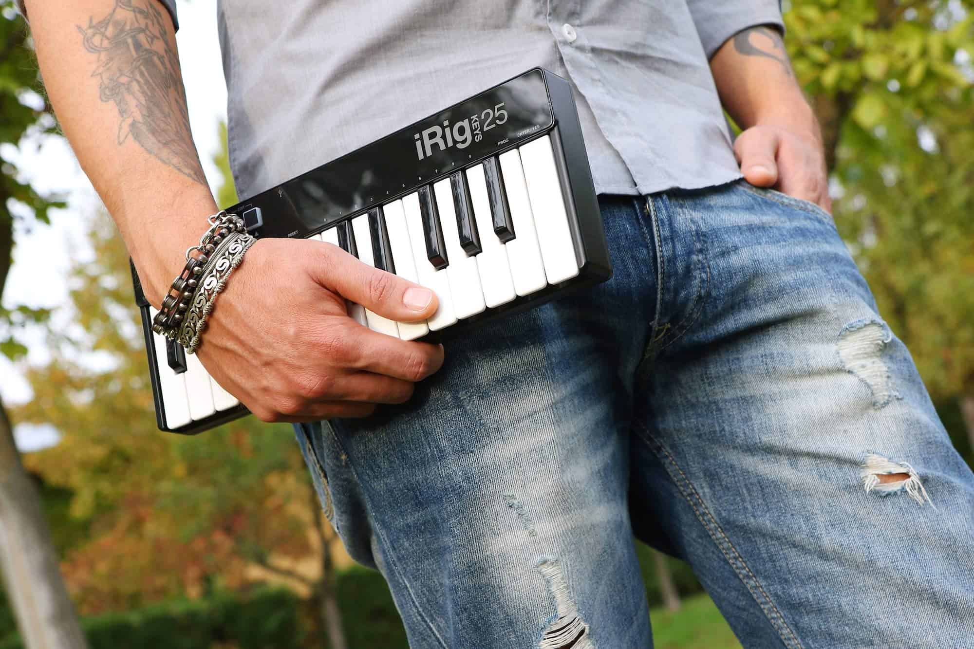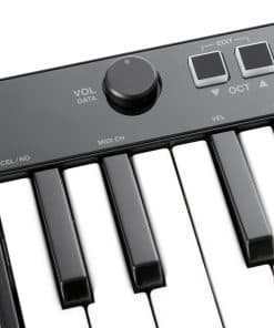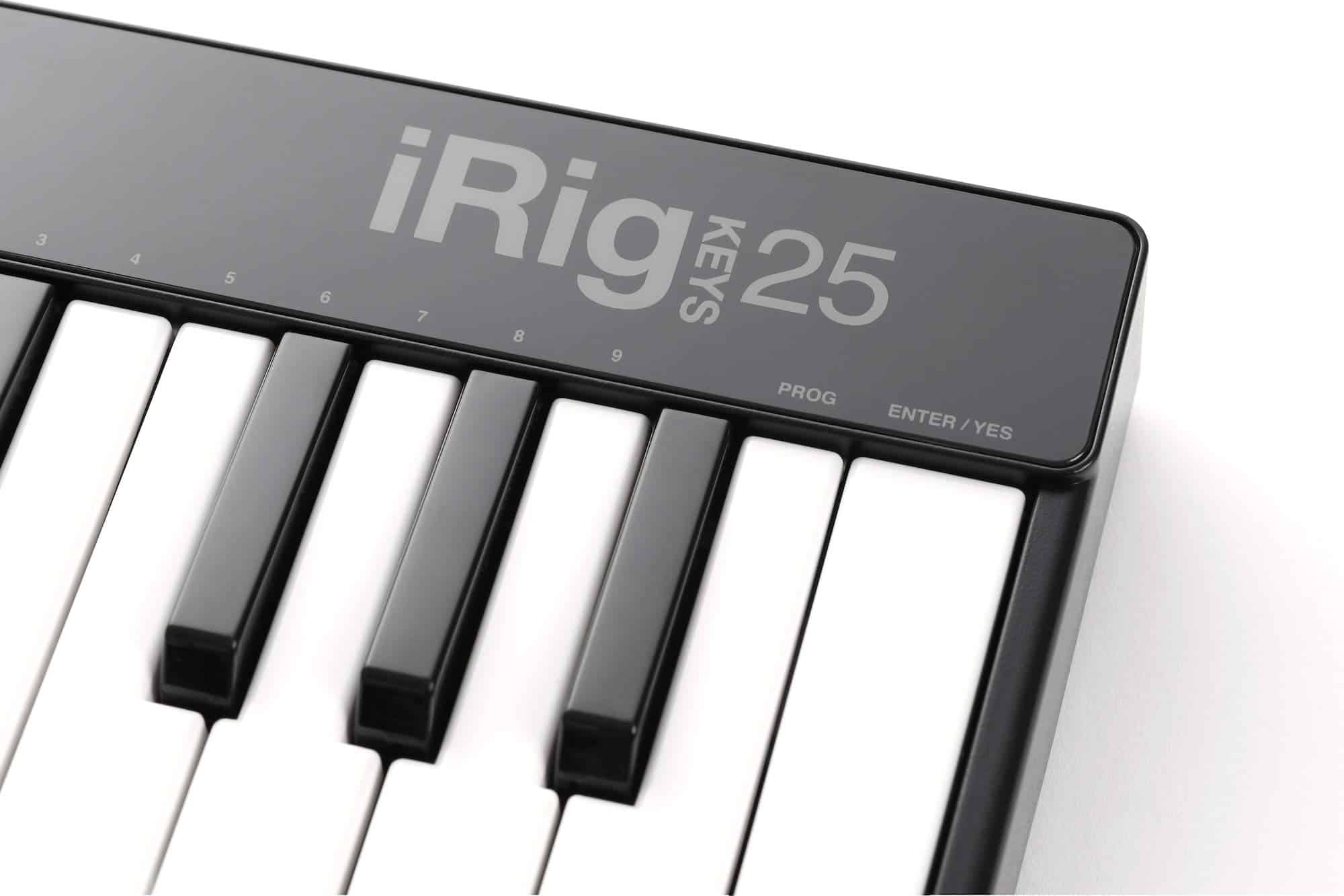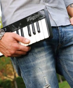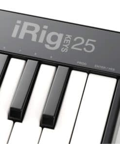 iRig Keys 25 USB con SampleTank SE. Las ideas musicales pueden surgir en cualquier momento y en cualquier lugar. ¿Por qué no estar preparado para cuando lleguen? iRig Keys 25 es un controlador MIDI USB ultra portátil, ultra asequible para Mac/PC. Sus 25 mini-teclas sensibles a la velocidad ofrecen un generoso rango de 2 octavas (más 1 nota), lo que también lo hace compacto y perfecto para guardar en tu bolsa de laptop, de conciertos o mochila. Su pequeño tamaño se corresponde con su igualmente pequeño precio. Ahora puedes tener un teclado contigo en todo momento sin arruinarte. Naturalmente, iRig Keys 25 también es increíblemente fácil de usar. Viene con un cable USB y es totalmente compatible con MIDI y USB, lo que significa que solo necesitas conectarlo a tu Mac o PC, abrir tu programa favorito y empezar a tocar. Estarás listo para empezar desde el primer momento: No se necesitan aplicaciones adicionales, software ni controladores para ponerse en marcha. iRig Keys 25 ha sido diseñado pensando en tu movilidad: No necesita un cable de alimentación porque obtiene toda su energía desde el puerto USB del Mac o PC conectado. También puedes utilizar iRig Keys 25 para actuaciones en vivo y otros usos creativos. Incluye un completo conjunto de potente software de IK Multimedia que te ayudará a empezar inmediatamente. El tamaño importa ¿Qué portátil es iRig Keys 25? Extremadamente portátil. La pequeña huella de sus 25 mini-teclas lo convierte en uno de los teclados más compactos y portátiles del mercado. Combínalo con su peso casi liviano y tendrás un controlador de teclado MIDI que ofrece una combinación imbatible de compacidad, conveniencia y funcionalidad completa. Un controlador pequeño con características impresionantes iRig Keys 25 te ofrece 2 octavas completas (más 1), lo que logra un equilibrio perfecto entre portabilidad y capacidad de juego.