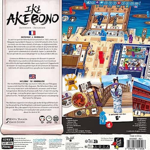 La expansión Iki: Akebono presenta un nuevo lugar por descubrir en Edo: el puente de Nihonbashi, que amplía la calle principal y ofrece a los jugadores nuevas oportunidades. Los jugadores pueden detenerse en el puente para encontrarse con personajes famosos de la era Edo (como Hokusai Katsushika, Sanyo Rai o Tokunai Mogami) y comerciar con los barcos (construidos por los jugadores) en el río. La expansión Akebono también agrega nuevas cartas de personajes, cartas de edificios y nuevos tokens de pipa, tabaco y pescado para una mayor profundidad estratégica y toma de decisiones. Se requiere una copia del juego base Iki para jugar.
