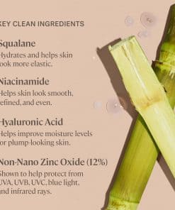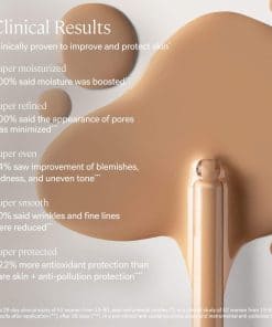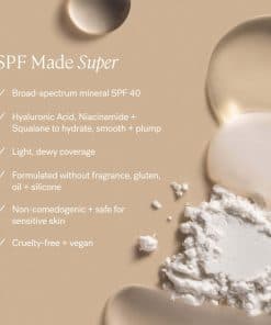 Este tintado limpio combina maquillaje, cuidado de la piel y SPF en un solo paso. Con cada uso, los activos para el cuidado de la piel hidratan, suavizan y refinan visiblemente la piel. El óxido de zinc no nano protege la piel de los rayos UVA/UVB/UVC, la luz azul y la contaminación. La niacinamida ayuda a suavizar la textura de la piel y a refinar el tono desigual. El ácido hialurónico ayuda a rellenar la piel y a reponer los niveles de humedad, y el escualano a base de plantas ayuda a hidratar y a mejorar la elasticidad sin obstruir los poros. El Super Serum Skin Tint ahora ha demostrado clínicamente mejorar y proteger la piel. El 100% dijo que la humedad aumentó, el 94% vio una mejora en las imperfecciones, enrojecimiento y tono desigual, y el 90% dijo que las arrugas y las líneas finas se redujeron. Vegano, libre de crueldad, libre de silicona, sin fragancia, sin aceite y no comedogénico. Seguro para pieles sensibles y probado por dermatólogos.
