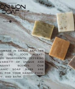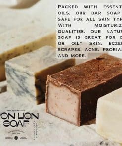 Nuestro compromiso con la salud de la piel es evidente en cada barra de jabón corporal. Este jabón vegano y orgánico está libre de productos químicos dañinos, asegurando que tu piel se sienta suave y limpia sin dejar residuos agresivos. Adecuado para todo tipo de pieles, incluidas las normales, sensibles, secas u oleosas. Disfruta de la sensación de lujo de nuestros jabones de baño que atienden tanto a hombres como a mujeres. Cada barra de Iron Lion Soap es una obra de arte, meticulosamente hecha a mano en pequeños lotes. El resultado es una gama diversa de aromas encantadores que realzan tu rutina de cuidado de la piel. La rica espuma deja tu piel suave y nutrida, proporcionando una limpieza efectiva y natural. Nuestros productos se pueden disfrutar como una barra de jabón de manos o como jabones de baño para tu rostro y cuerpo. Nos enorgullecemos de nuestra amigable y plant-based aproximación. Nuestro jabón natural viene en un empaque reciclado postconsumidor, encarnando nuestra dedicación tanto a tu bienestar como al medio ambiente. Cuando eliges Iron Lion Soap, eliges un mañana más verde. Perfecto para pieles sensibles, nuestro jabón hecho a mano hace que cada lavado sea un paso hacia una sensación de limpieza y frescura.