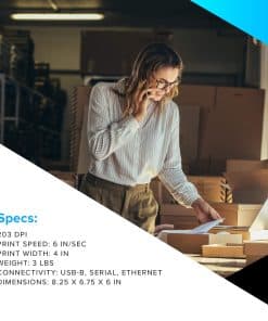 1. Impresora térmica directa monocromática con conexiones Ethernet/serie/USB de 10/100 y dispensador de etiquetas imprime 1″ por segundo más rápido que la Zebra GK420T y tiene la huella más pequeña de las impresoras de etiquetas Zebra de 4″. 2. Impresión de 203 dpi (8 mm), diseño de carga de medios OpenACCESS y impresión habilitada para XML ayudan a aumentar la eficiencia del trabajo. 3. Construcción de doble pared ABS para durabilidad. 4. Memoria SDRAM de 8 MB con memoria flash de 4 MB y procesador RISC de 32 bits para un alto rendimiento. 5. Sensores de medios transmisivos y reflexivos para diferentes tipos de etiquetas