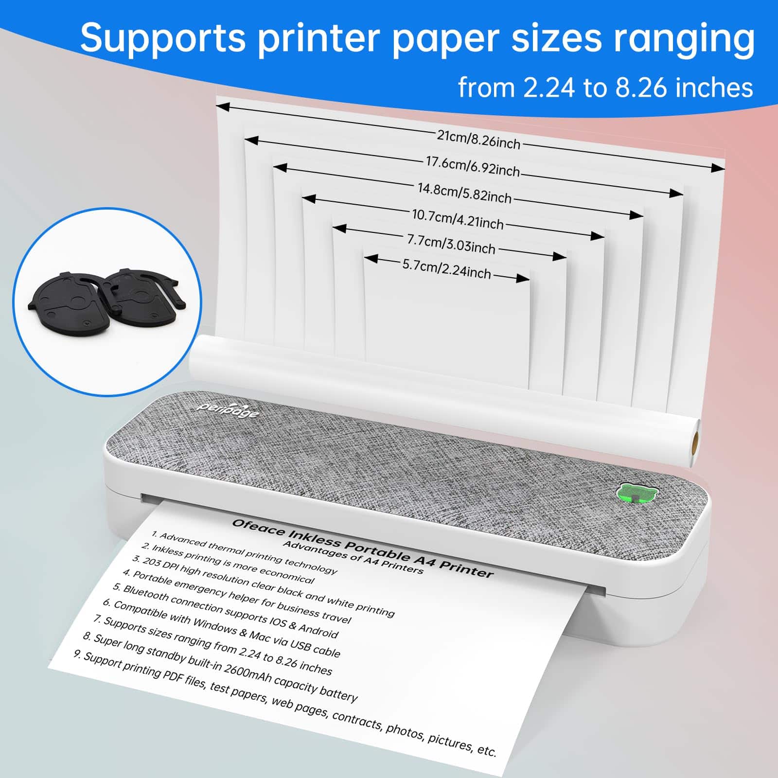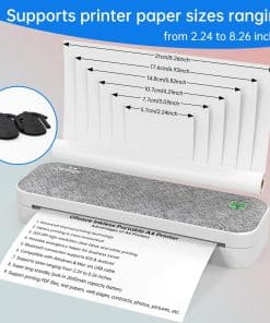 2. Más Opciones de Impresión La impresora portátil A4 tiene un tope incorporado para ajustar el ancho de la ranura del papel, que se puede cambiar de forma flexible para imprimir en papel térmico de 216mm/210mm/107mm/77mm/57mm (carta de EE. UU./A4/4″/3″/2″) de ancho. También soporta rollos y papel plegado. ¡Satisface tus necesidades de impresión para muchas ocasiones!.