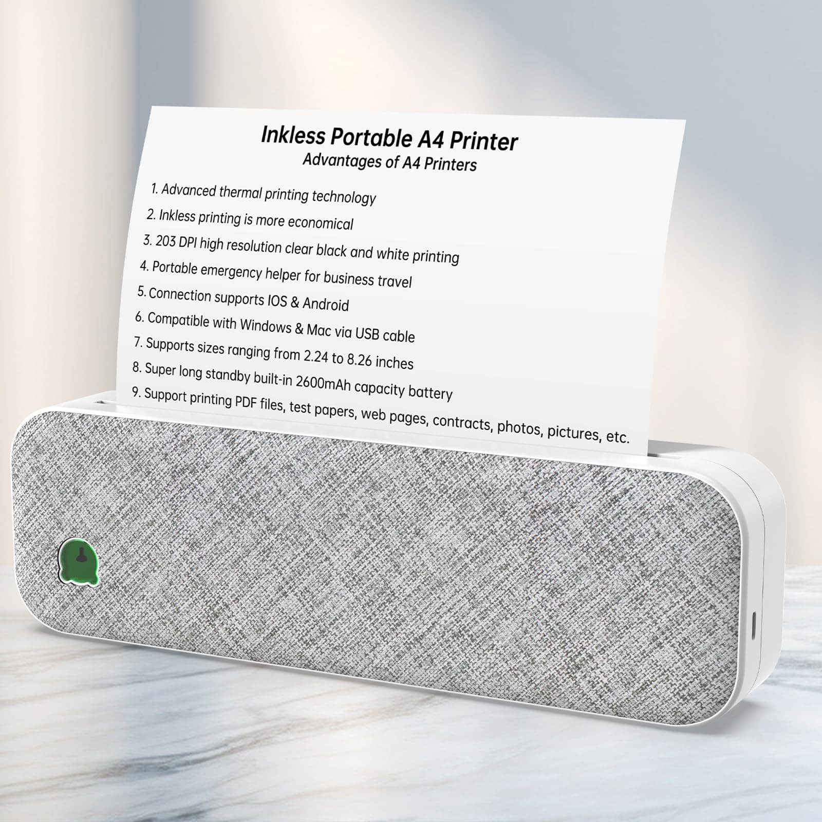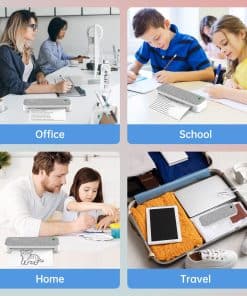 1. Portátil y Eficiente La impresora portátil es compacta y ligera, con un peso total de 658g, equivalente a una botella de agua mineral, que se puede guardar fácilmente en un bolso de mano o maletín. Adecuada para viajes de negocios, escuela, automóvil y otras situaciones móviles, imprime en cualquier lugar y en cualquier momento. Puedes manejar fácilmente documentos oficiales, etiquetas de envío, dibujos de diseño y documentos de exámenes en el momento. ¡Un ayudante para situaciones de emergencia!.