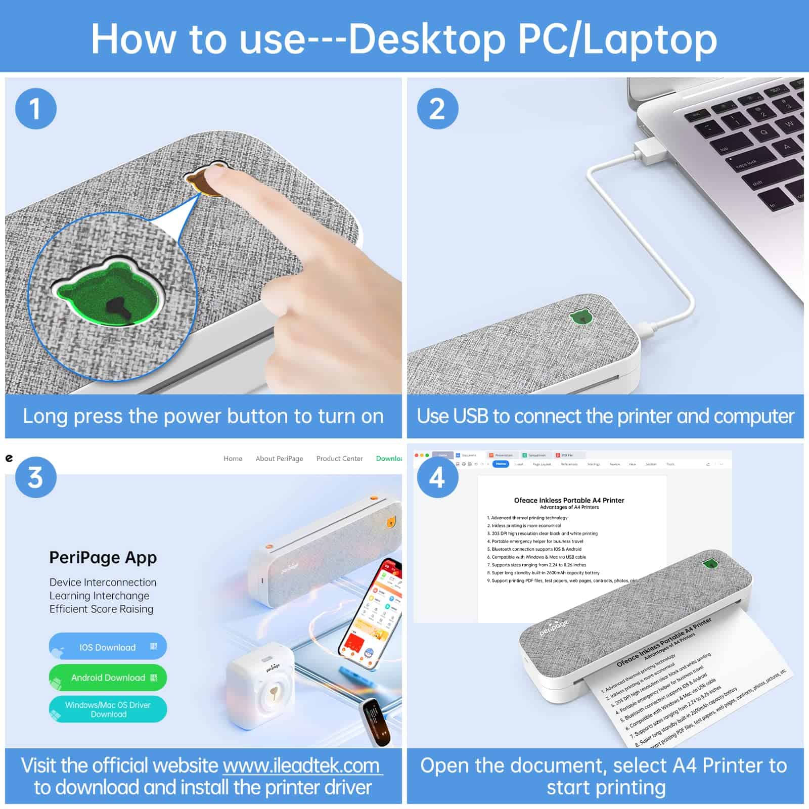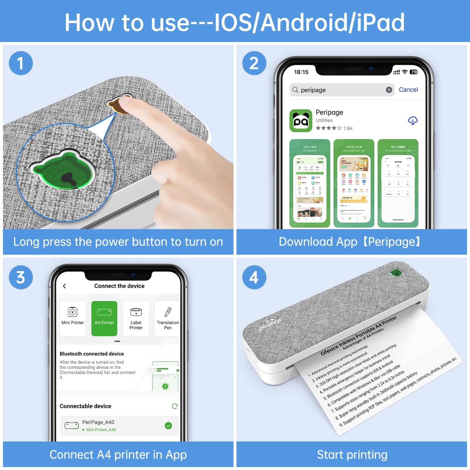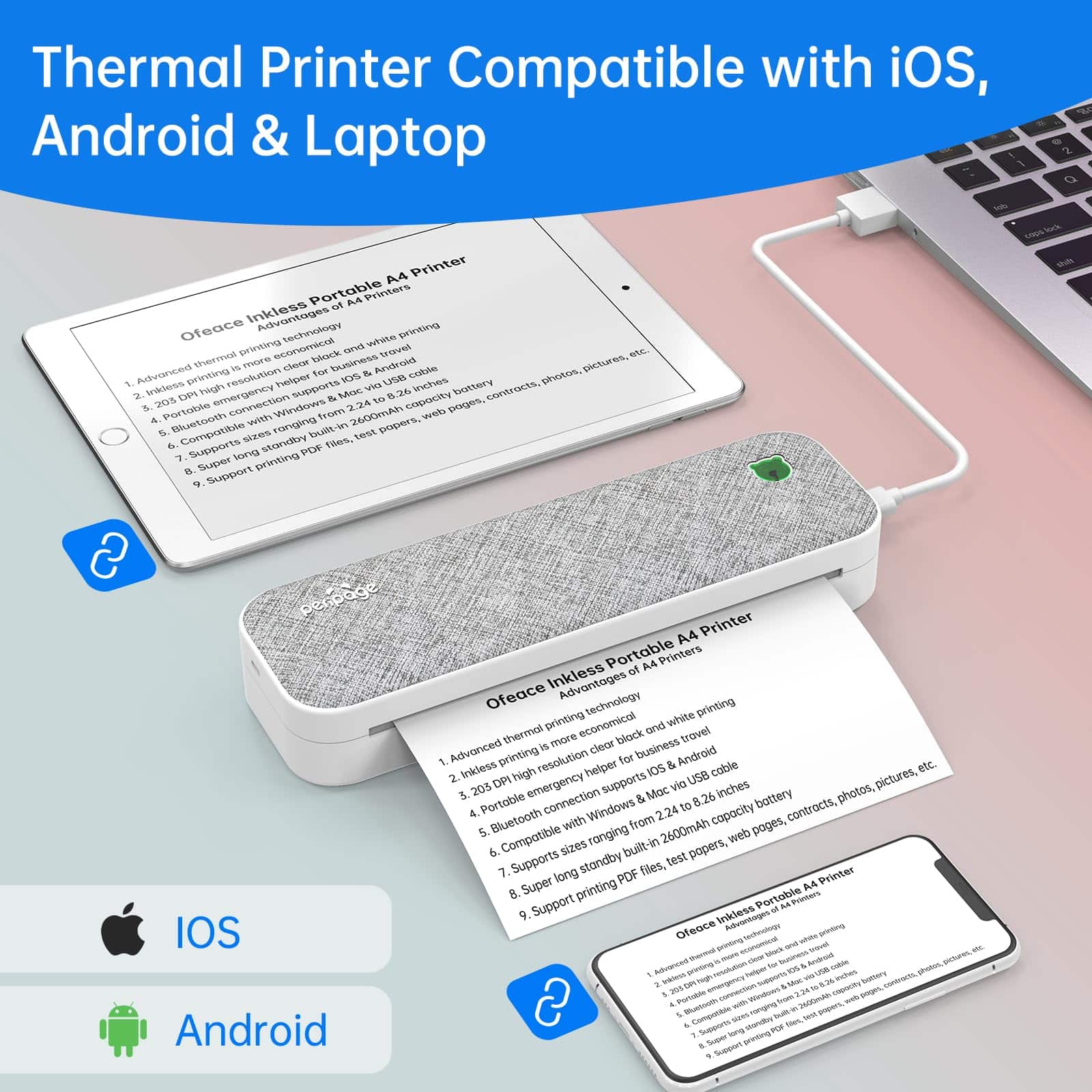 3. Impresora Todo en Uno La impresora térmica soporta conexión Bluetooth para teléfonos IOS y Android, y soporta conexión USB para Windows 7-11 Nota: La conexión al computadora necesita usar el cable de datos incluido en el paquete). ¡Conexión rápida y funciona directamente desde la caja! La impresora térmica portátil está equipada con una amplia gama de formatos de archivo, Word, Excel, PPT, TXT, JPG. La aplicación de impresión también soporta la impresión de plantillas y fotos. Una impresora para crear múltiples valores.
