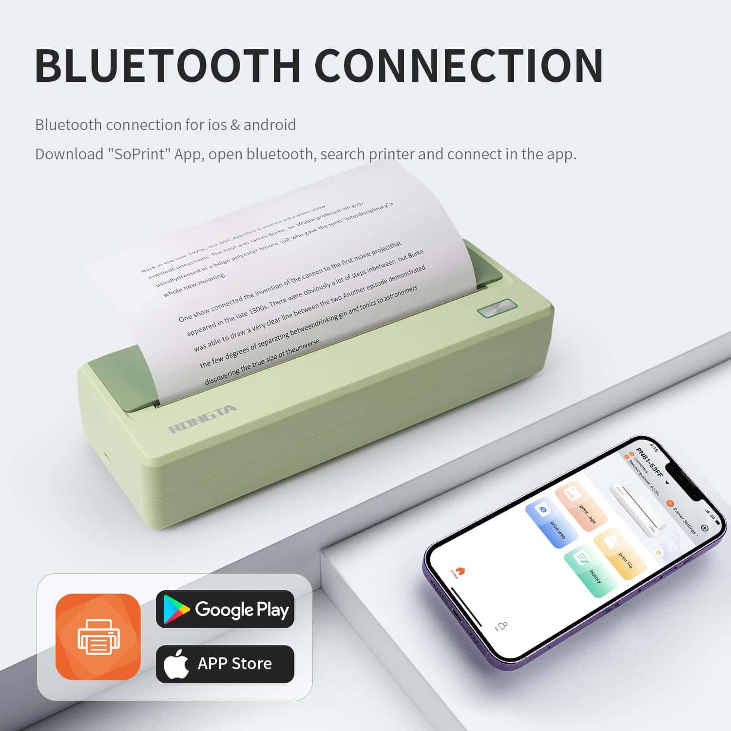 1. Recordatorio: Por favor descargue la aplicación SoPrint de antemano al usar un teléfono inteligente para imprimir, descargar desde Google Play para teléfonos Android, descargar desde App Store para iPhone. Las computadoras portátiles y PC necesitan instalar el controlador primero (el disco USB incluye el controlador), contáctenos si tiene alguna pregunta sobre el uso.