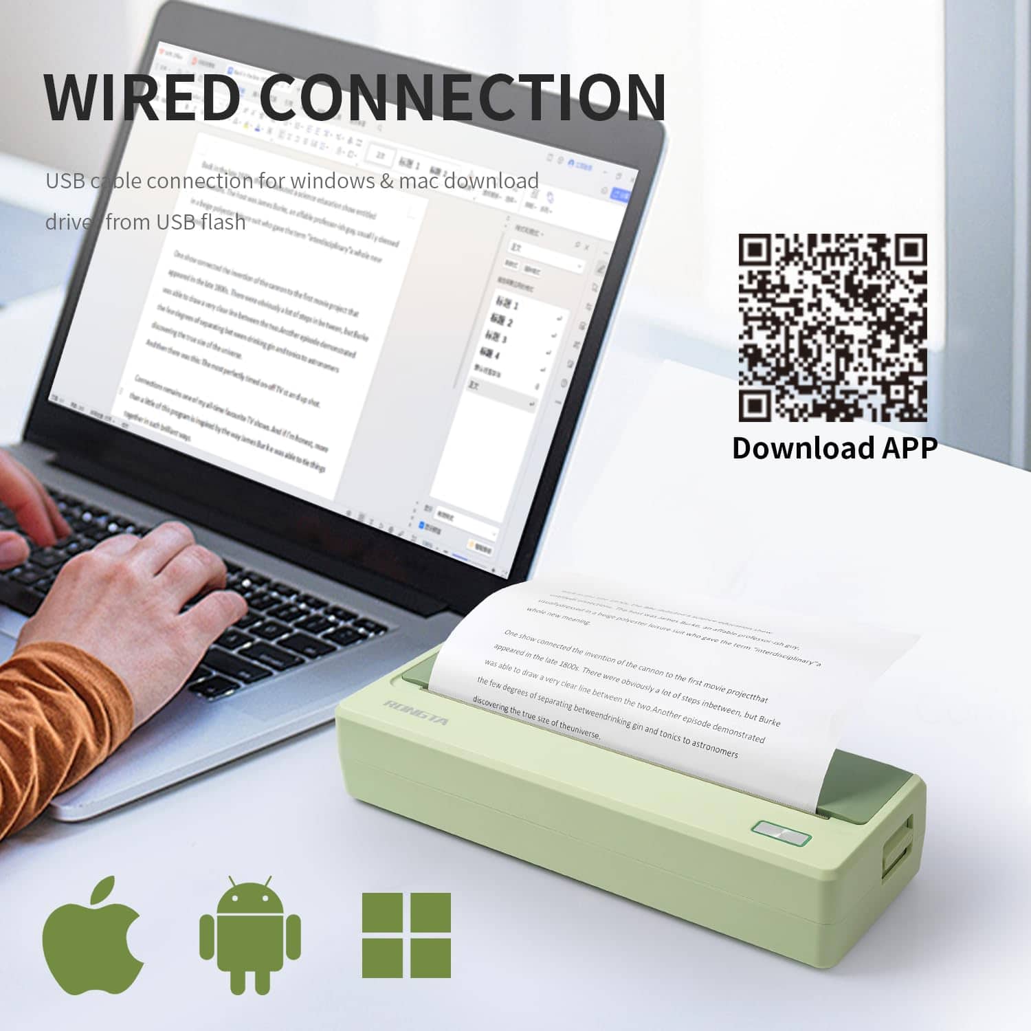 5. Impresora portátil Bluetooth inalámbrica, fácil de descargar la aplicación SoPrint desde Google Play o la tienda de aplicaciones de iOS. La impresora portátil A4 admite la conexión Bluetooth para iOS y Android. Compatible con la conexión USB Tipo-C para Windows 7 y superior y MacOS.