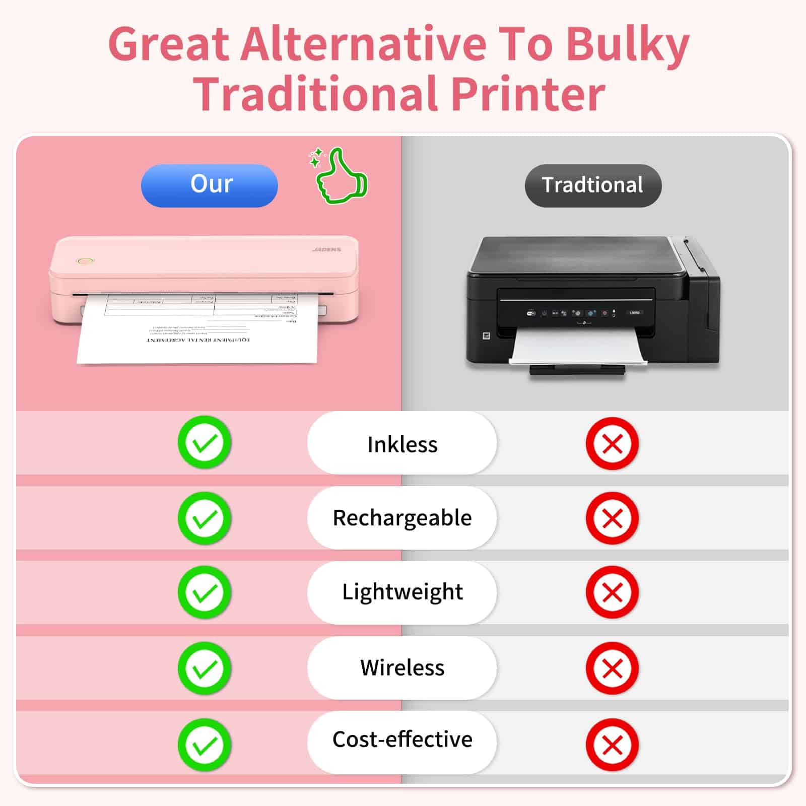 JADENS Portable Printers Wireless fot Travel, Support 8.5» x 11» Thermal Paper, 300DPI Inkless Printer for Laptop, Compatible with iOS, Android
