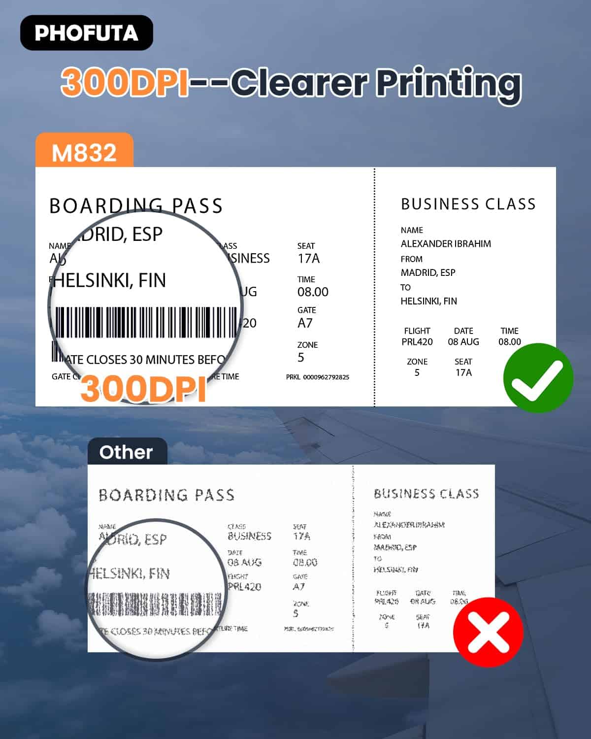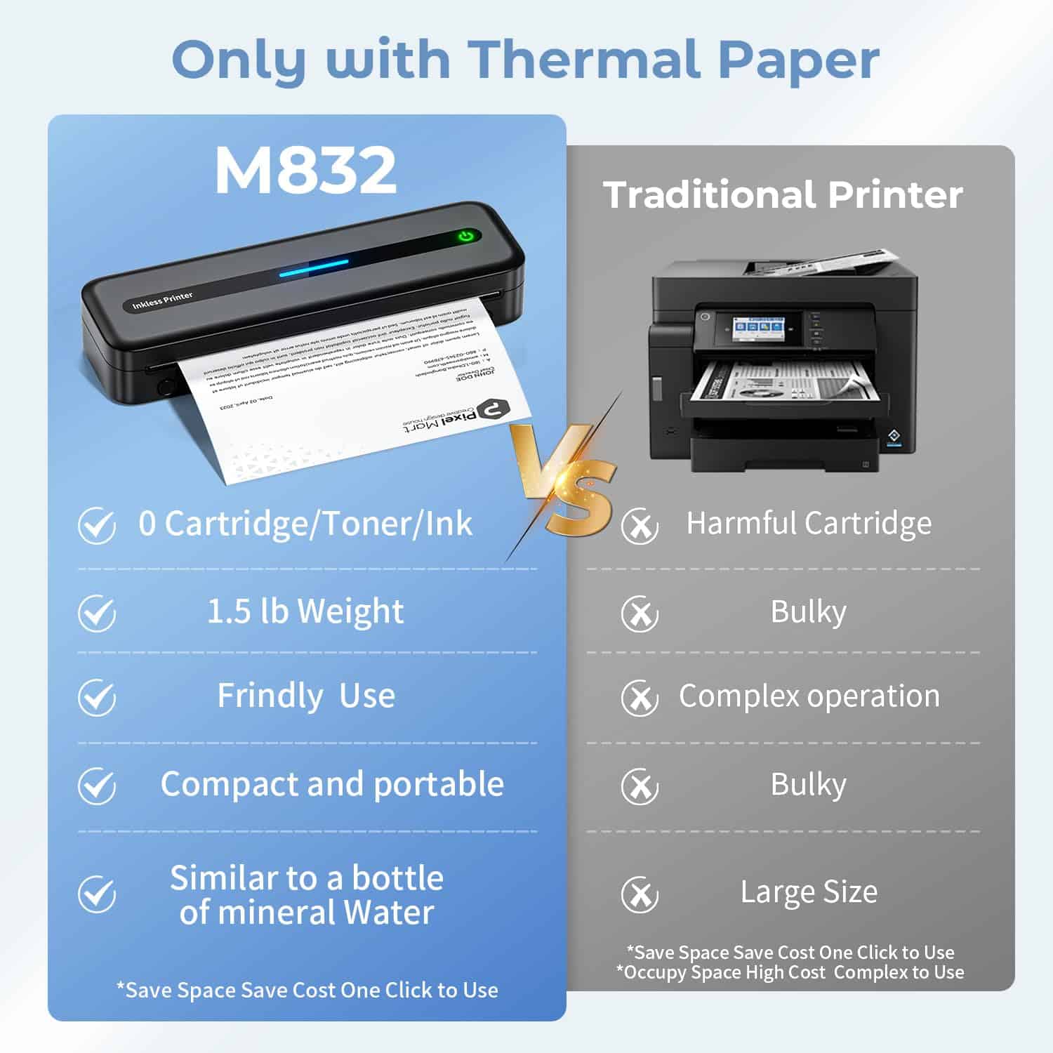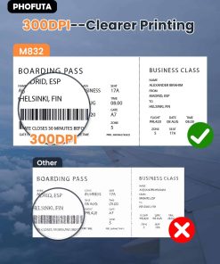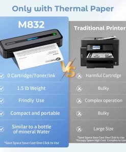 3. Ayuda para ahorrar dinero y tiempo: ¡Impresora térmica M832! ¡Sin tinta, cinta, ni tóner – maravilla sin costo! ¡Sin problemas de obstrucción y limpieza! Simplemente use papel térmico, a un costo tan bajo como $0.12 por hoja, puede imprimir de manera más ecológica, eficiente y económica. Además, la impresión sin tinta no contaminará su equipaje y artículos. ¡Tan sabio eres, no te lo pierdas!