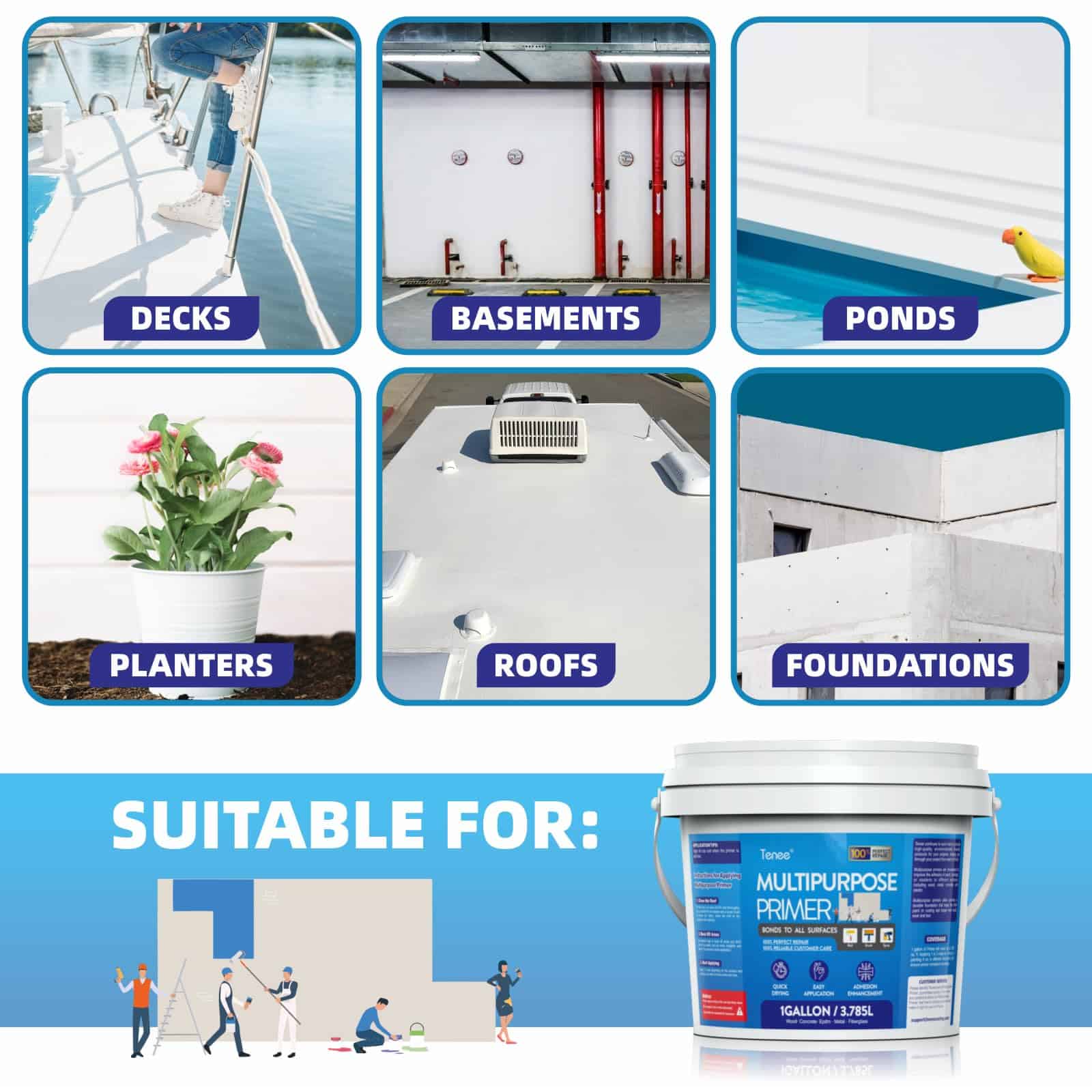 2. Se Adhiere a Todas las Superficies: Este imprimador de goma líquida es compatible con una amplia gama de materiales, incluyendo metal, madera, concreto, plástico, techos de RV, cubiertas de piscinas, cubiertas, sótanos, macetas y paisajismo de estanques, lo que lo hace adecuado para diversas aplicaciones. Ayuda a preparar fácilmente una variedad de superficies.