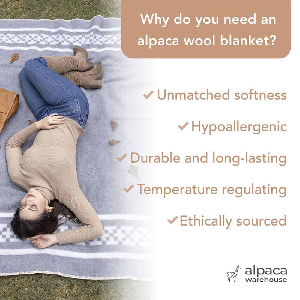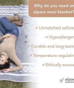 ¡PERFECTO PARA LAS NOCHES MÁS FRÍAS! Acúrrucate con nuestra manta de lana de alpaca para un confort que no encontrarás en ningún otro lugar. Lujosamente gruesa y pesada, nuestra manta de lana te envuelve en un manto de calor que bloquea eficazmente el frío. Pero como sigue siendo transpirable, no hay sobrecalentamiento incómodo. ¡Ordena tu manta de lana ahora y envuélvete en confort!