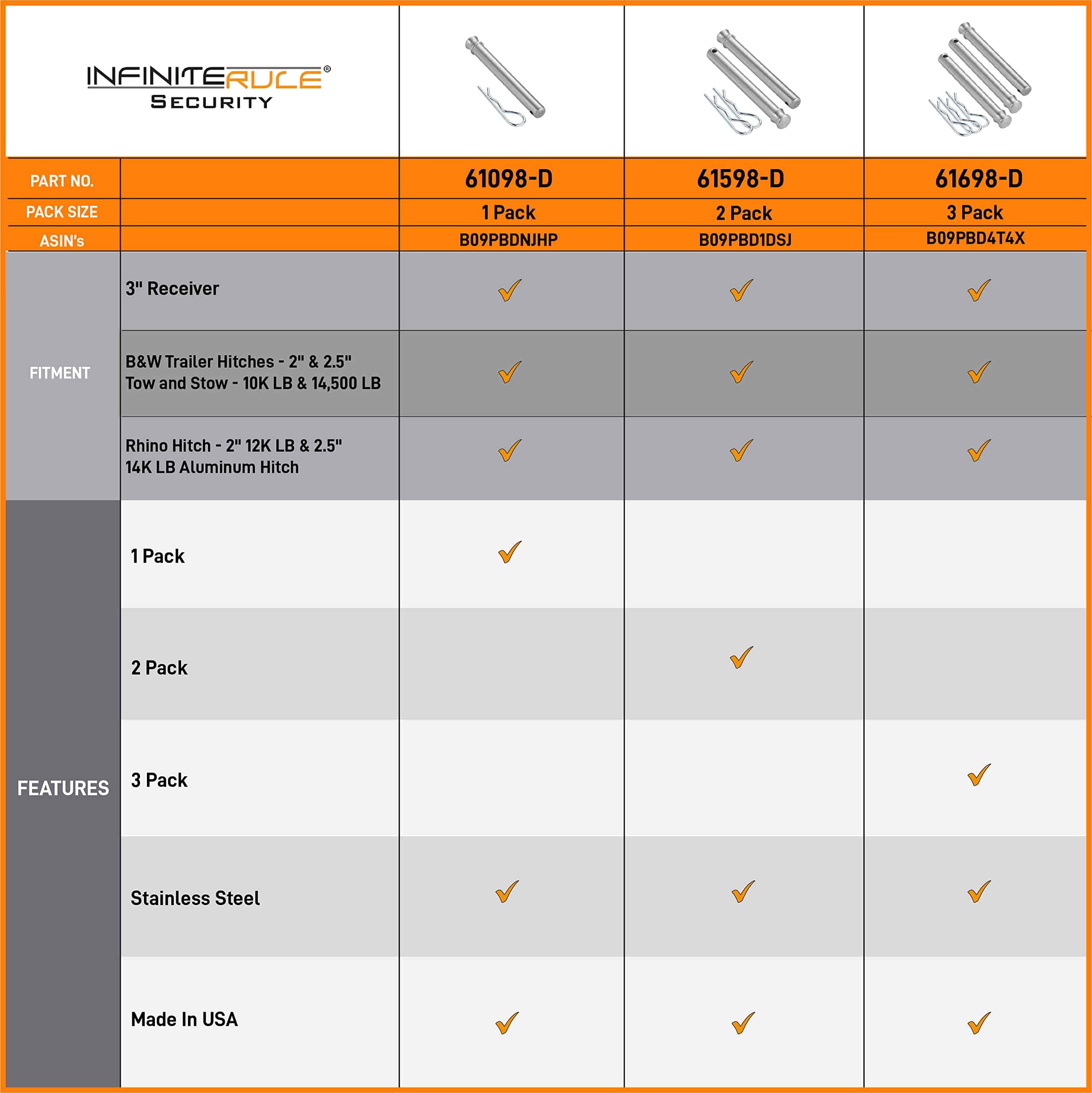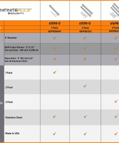Mantén tu Enganche y Accesorios Seguros con los Pernos de Enganche a Medida de InfiniteRule. Al Remolcar un Remolque o Equipo, No lo Dejes Vulnerable al Robo Con los Pernos de Enganche Keyed Alike 61698 de InfiniteRule Diseñados Específicamente Para Adaptarse al Enganche de Bola de 2″ y 2.5″ Tow And Stow 10K LB & 18K LB de B&W, Estos Pernos Resistentes Disuadirán a los Delincuentes de Desconectar tus Valores. Los Pernos de Enganche de Acero Inoxidable Maquinados Incluidos Son Rigurosamente Probados Con una Clasificación de Servicio Pesado de 21K LB, Por lo que Puedes Confiar en que Resistirán los Intentos de Romperlos, Cortarlos o Picarlos. Las Tapas de Goma Impermeables Ajustadas Mantienen Alejada la Suciedad, el Agua y la Grasa Para que los Pernos Sigan Funcionando sin Problemas. Proteger tu Inversión es Nuestra Prioridad. Es por eso que los Pernos de Enganche de InfiniteRule son 100% Hechos en los EE. UU. con Materiales Premium que Resisten la Oxidación y la Corrosión. Fabricamos, Enviamos y Servimos Nuestros Productos de Seguridad Domésticamente, Respaldándolos con Nuestra Promesa a los Clientes. Antes de hacer un pedido, verifica que el ajuste de la longitud y el diámetro del perno se ajuste a tu enganche específico.