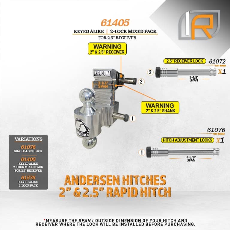 Mantén Seguro tu Enganche y Accesorios con los Candados de Ajuste Personalizado de InfiniteRule. ¿Arrastrando un remolque o equipo? No lo dejes vulnerable al robo con el candado de enganche y receptor mezclado 2.5, con llave alike de 2 paquetes de InfiniteRule. Específicamente diseñados para ajustarse al enganche Andersen Rapid Drop Hitch – Incluye Candado para Receptor de 2.5″, estos robustos candados disuadirán a los criminales de desenganchar tus objetos de valor. Los incluidos candados de acero inoxidable mecanizado son rigurosamente probados con una clasificación de resistencia de 21K LB, por lo que puedes confiar en que resistirán los intentos de romper, cortar o forzarlos. Las tapas de goma impermeables ajustadas mantienen fuera la suciedad, el agua y la mugre para que los candados sigan funcionando sin problemas. Proteger tu inversión es nuestra prioridad. Por eso, los candados de enganche y receptor de InfiniteRule son 100% fabricados en EE. UU. con materiales de primera calidad que resisten el óxido y la corrosión. Fabricamos, enviamos y mantenemos nuestros productos de seguridad en el país, respaldándolos con nuestra promesa a los clientes. Antes de ordenar, verifica que la longitud y el diámetro del candado se ajusten al enganche y receptor específicos que tienes. Los paquetes mezclados incluyen un candado de receptor adicional con pasadores más largos o más cortos para adaptarse a diferentes tamaños de receptores si es necesario. Mereces tener tranquilidad sabiendo que tu remolque no se convertirá en el próximo objetivo de un criminal. Elige InfiniteRule para una seguridad personalizada y resistente y desbloquea el camino hacia la aventura.