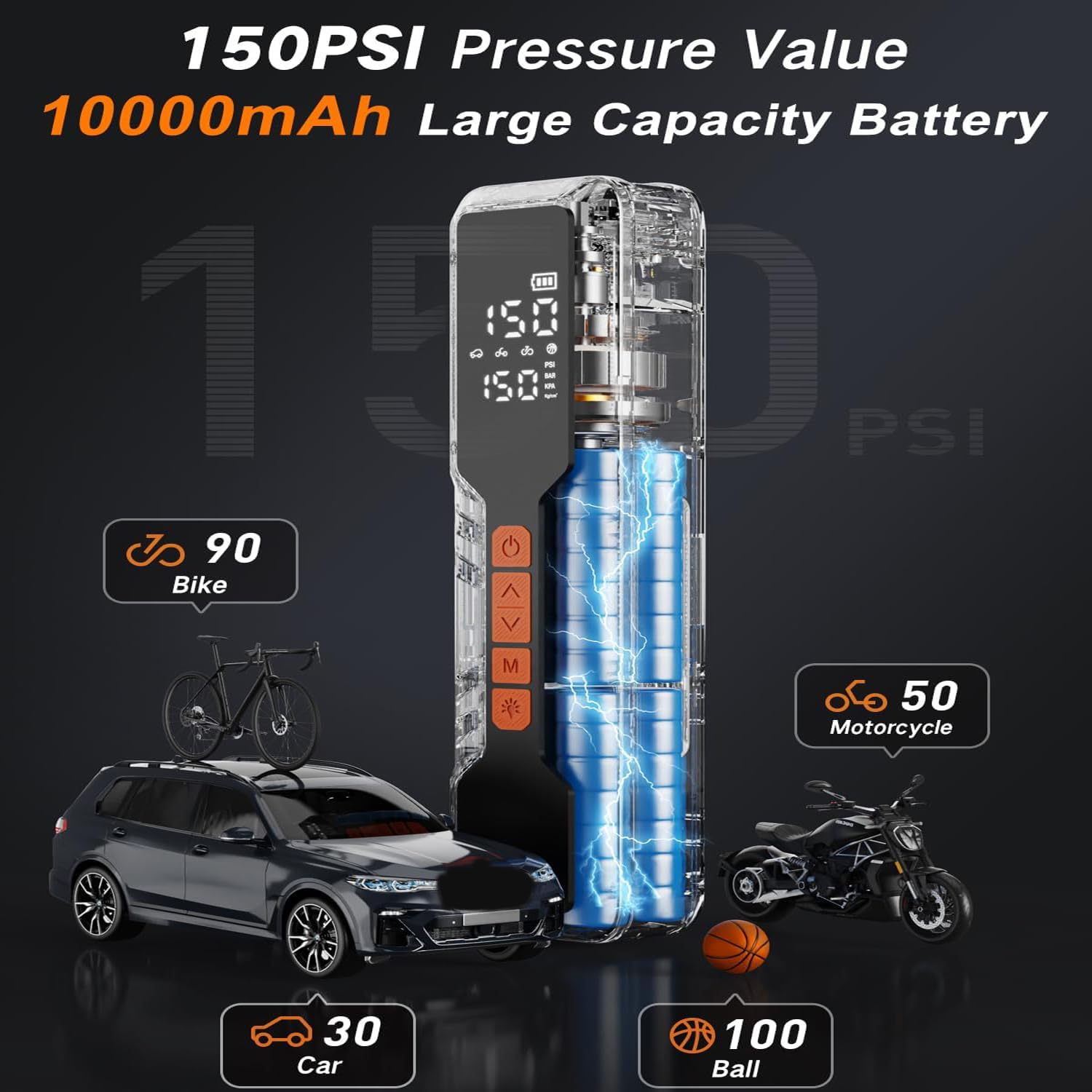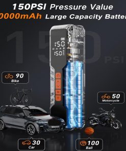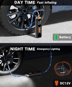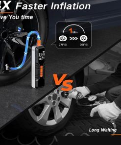 1. Portátil y operación simple. La bomba de aire compacta y pequeña cabe en tu mochila, maletero y guantera. Fácil de usar, selecciona el modo de inflado y el valor de presión de aire que necesitas con el botón + – , presiona y mantén presionado el botón «M» para confirmar e inflar, perfecto para emergencias, actividades al aire libre y viajes de campamento.