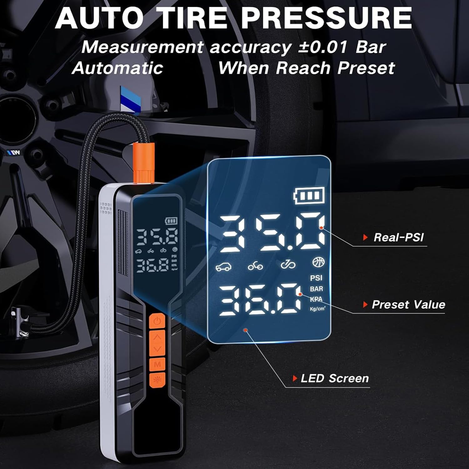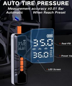 2. Preciso y auto-stop: El compresor de aire portátil para llantas de coche está equipado con un medidor de presión incorporado y una pantalla LCD, proporcionando un monitoreo preciso de la presión en tiempo real. Cuenta con una práctica función de presión preestablecida y autoapagado, lo que permite inflar las llantas sin preocupaciones. Se detiene automáticamente cuando se alcanza la presión deseada en la llanta, previniendo la sobreinflación y asegurando un rendimiento y seguridad óptimos de las llantas.