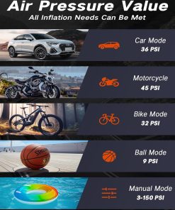 4. Uso versátil: El inflador de llantas viene con cuatro tipos de boquillas de aire y una manguera de aire de nylon. Utiliza la válvula estándar de EE. UU. para coches, SUV, motocicletas y llantas de bicicleta, el adaptador de aguja es perfecto para inflar equipos deportivos como balones de baloncesto, y el adaptador general funciona bien para anillos de nado, cojines, almohadas de aire y más. Nota: No es adecuado para artículos de gran volumen como colchones de aire o llantas de servicio pesado.
