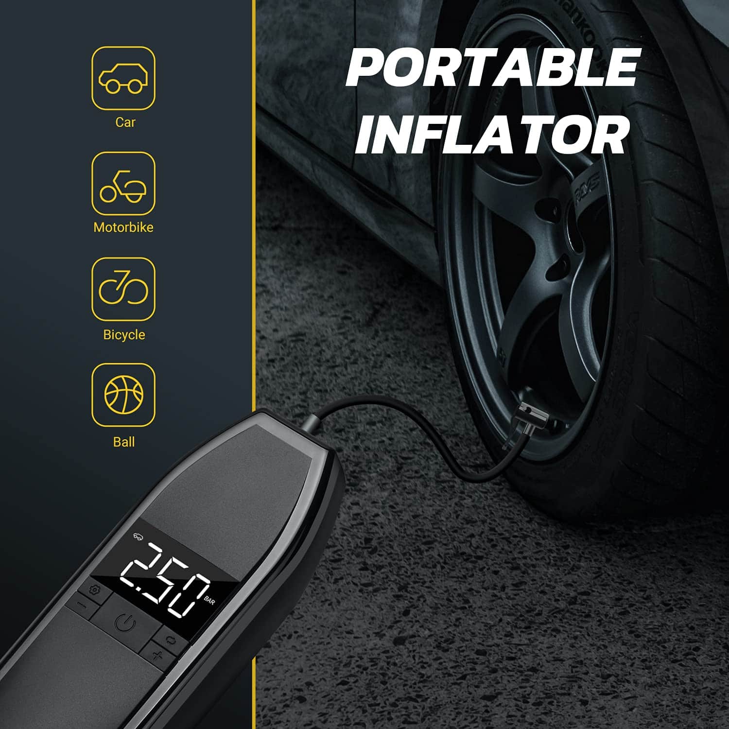 1. COMPRESOR DE AIRE PORTÁTIL – Infle las llantas de su coche, motocicleta o scooter con esta pequeña bomba eléctrica portátil. Gracias a sus diferentes puntas, se adapta a sus llantas (excepto 4×4 y camión). Es pequeño y compacto para llevarlo a todas partes.