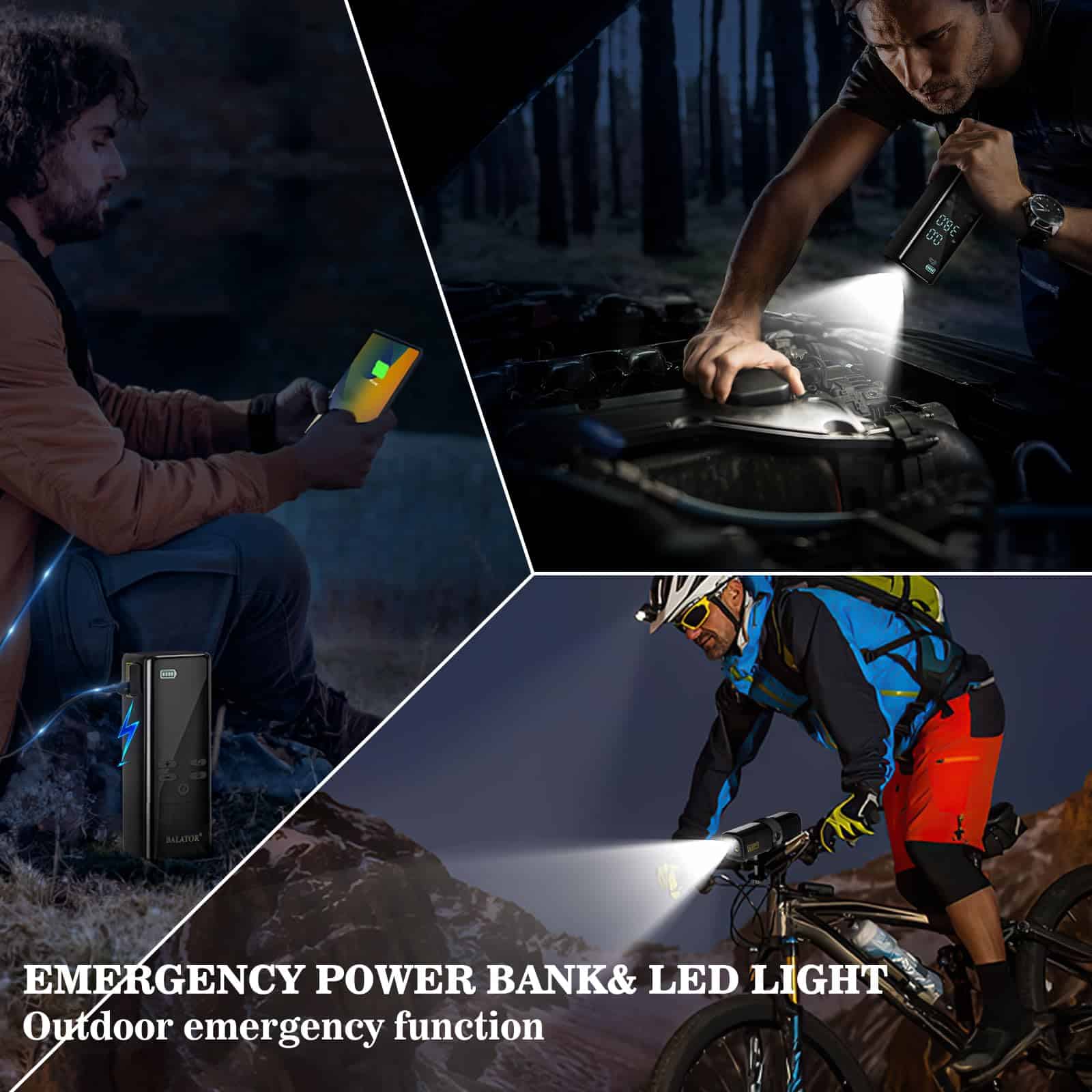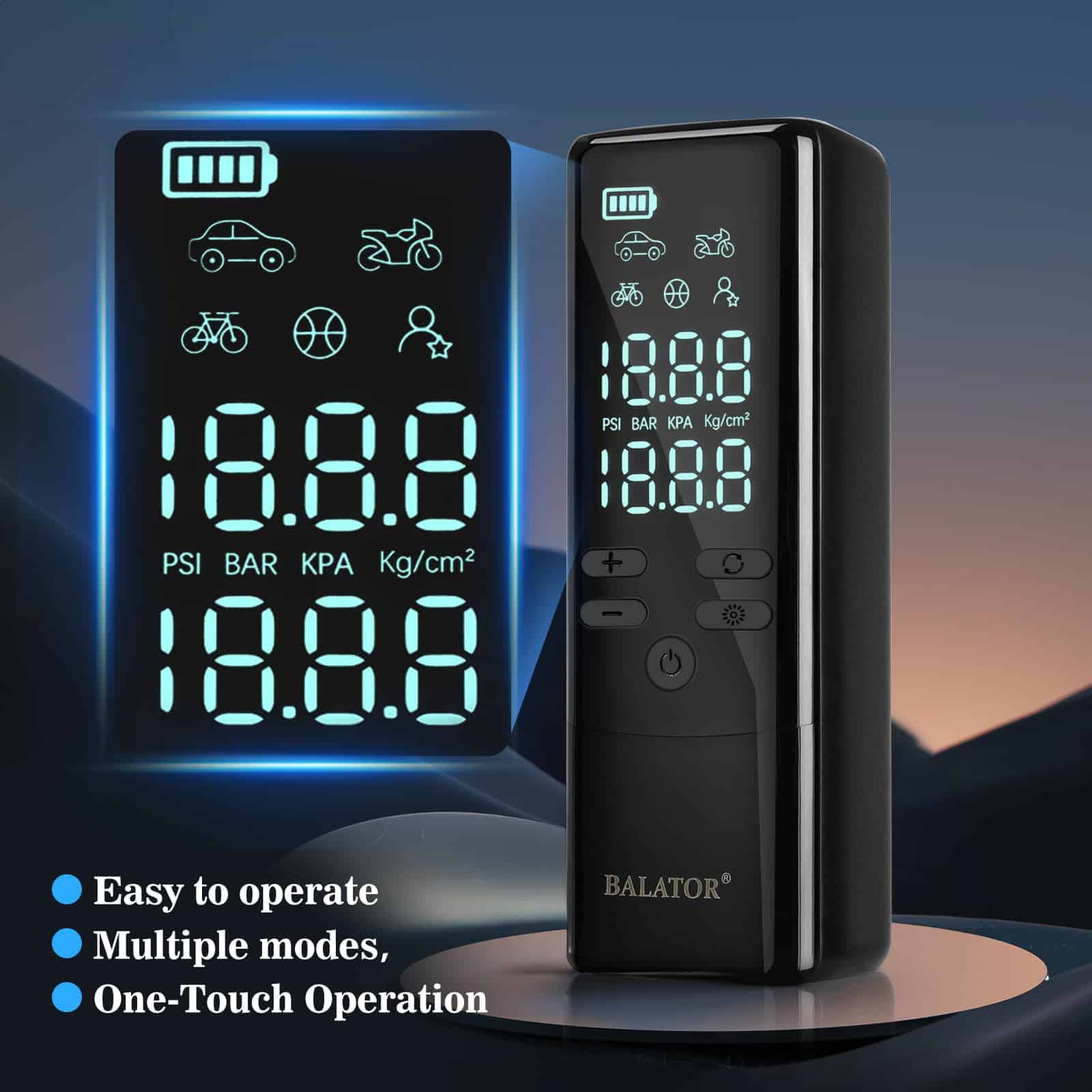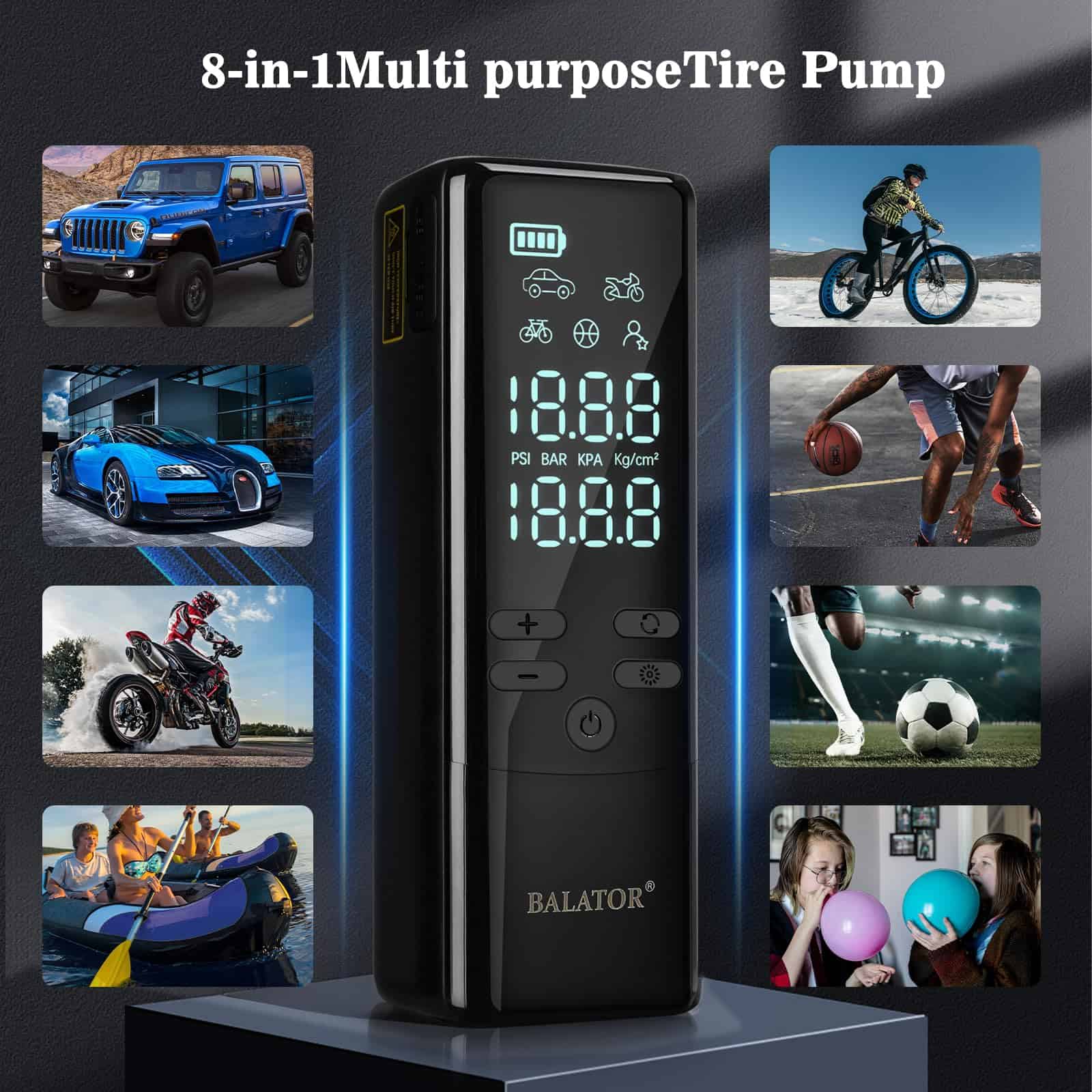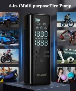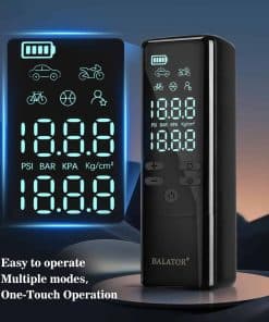 Incluye una batería de gran capacidad y multifunción: El inflador de aire sin cable de Balator tiene una batería recargable integrada de alta capacidad de 20000mAh. Más que un simple inflador de neumáticos portátil. El compresor de aire para coche también puede utilizarse como fuente de energía exterior con una luz LED en la parte superior. La bomba de aire portátil ayuda a ofrecer comodidad para inflar y cambiar neumáticos en lugares oscuros. Equipado con pantalla LCD dual precisa y apagado automático: El inflador de neumáticos para coche está equipado con pantallas LCD digitales duales. El inflador de neumáticos monitoriza la presión de los neumáticos con precisión, precisa hasta +/-0.5 PSI. La función de apagado automático del inflador de neumáticos del coche garantiza que tus neumáticos alcancen la presión perfecta, evitando la sobreinflación y manteniendo la seguridad. Con 8 modos de inflado: El inflador de neumáticos para coche de Balator ofrece 8 modos preestablecidos para diferentes usos (Coche, Motocicleta, Bicicleta, Bola, Personalizado) y 4 unidades de presión (PSI, KPA, BAR, KG/CM). Esta flexibilidad convierte al inflador de neumáticos portátil en el compañero definitivo para todas tus necesidades de inflado. El inflador de neumáticos portátil es un regalo perfecto para hombres. Diseño compacto y portátil: El diseño compacto y ligero del inflador de neumáticos de Balator ofrece la combinación perfecta de portabilidad y funcionalidad. El compresor de aire se puede almacenar fácilmente en una mochila, montado en una bicicleta o guardado en tu coche. Este compresor de aire portátil es ideal para emergencias, actividades al aire libre o camping, listo para su uso cuando sea necesario.