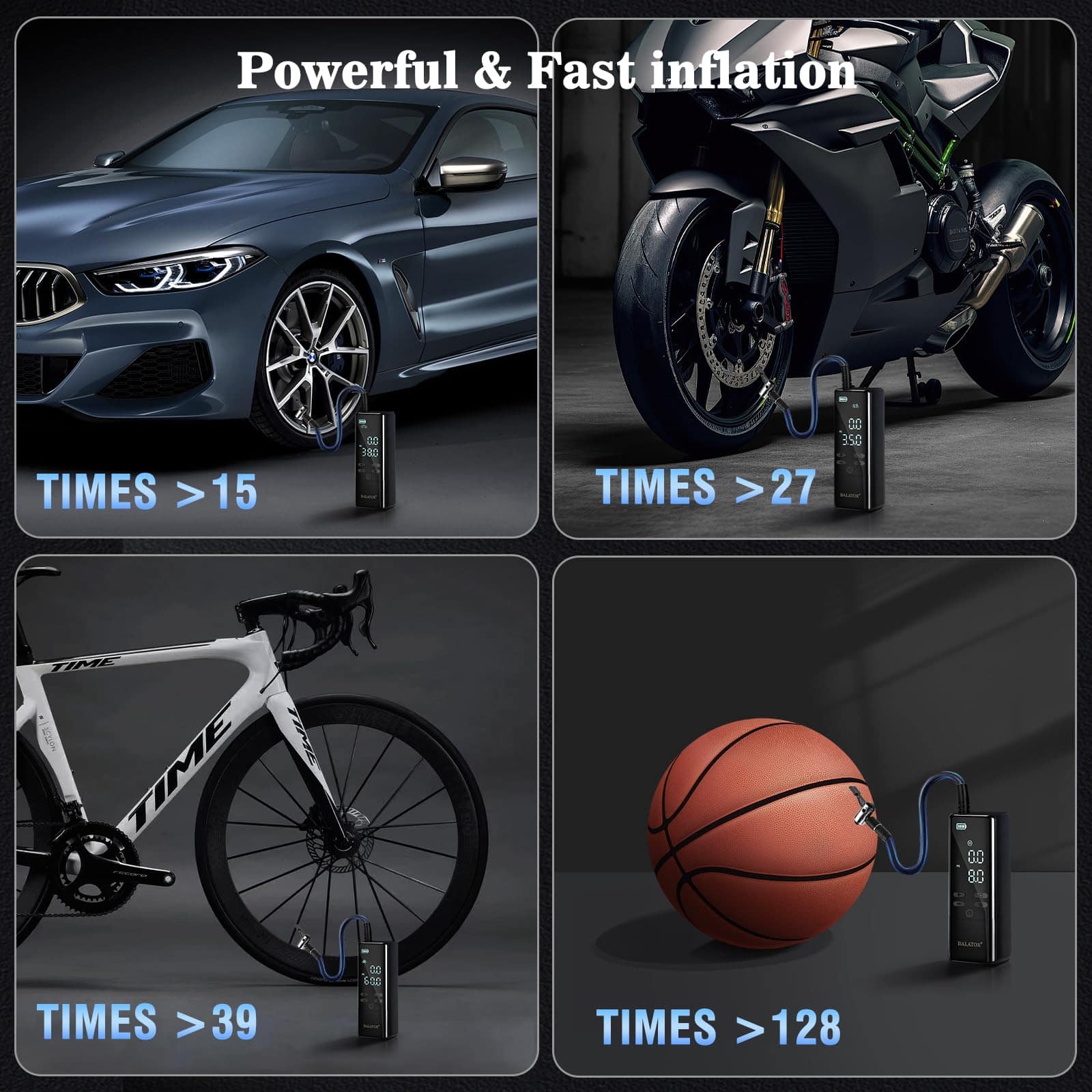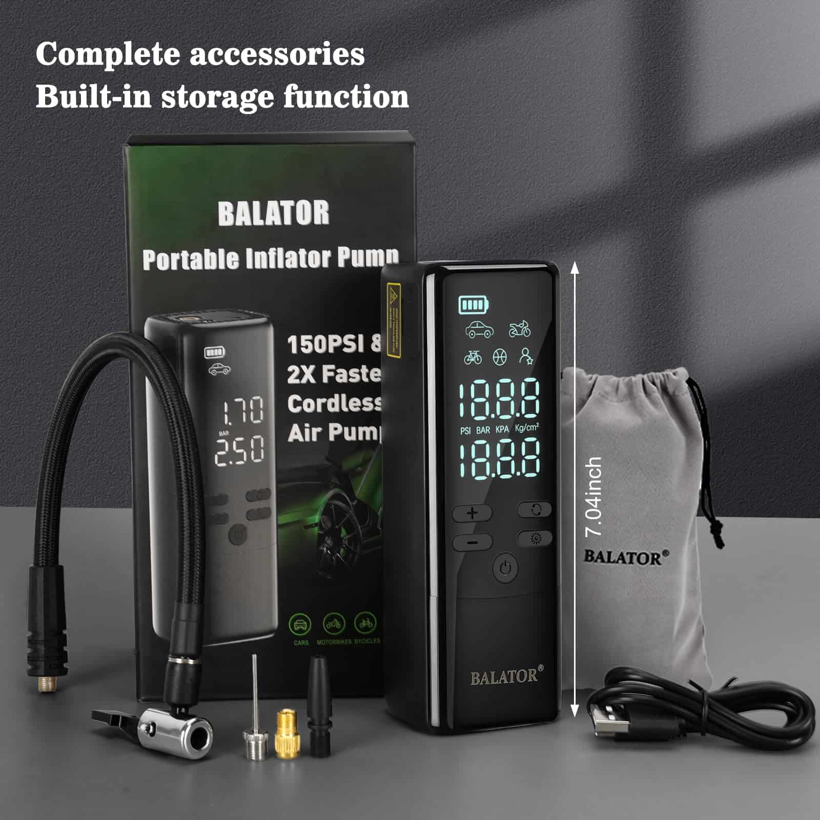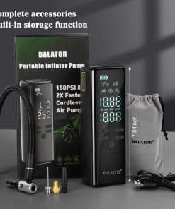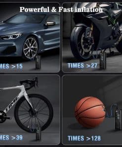 1. Velocidad de Inflación Rápida: Logra la presión óptima de los neumáticos en segundos con el compresor de aire portátil de Balator. El inflador de neumáticos portátil para coche alcanza 160 PSI con una tasa de flujo de 35 L/min. La bomba de aire para neumáticos de coche infla un neumático a 30-36 PSI en menos de un minuto, garantizando un viaje seguro y rápido con el inflador de neumáticos portátil para coches. Inflador de Neumáticos Compresor de Aire Portátil.
