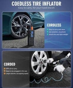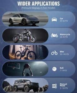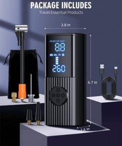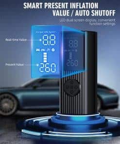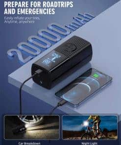 2. Modo de inflado 4+N El compresor de aire tiene cuatro tipos de unidades de presión: PSI, KPA, BAR y KG/CM². Hay cuatro modos de inflado preestablecidos: bicicleta, motocicleta, coche y balón. El quinto modo personalizado también puede configurar valores de presión en función del objeto de inflado para satisfacer diversas necesidades de inflado. Es un producto esencial para la vida diaria y los viajes. 3. Compresor de aire multifuncional Además de servir como un compresor de aire portátil, también es una herramienta de emergencia multifuncional. Tiene una luz LED en la parte superior que se puede utilizar para inflar en la oscuridad, cambiar neumáticos o advertir a otros vehículos por la noche. La parte superior también incluye un puerto de carga tipo C y un puerto de salida USB 5V/2A, lo que le permite servir como una fuente de alimentación de emergencia para dispositivos electrónicos. 4. Pantalla de doble pantalla La bomba de aire portátil incorpora un chip de alto rendimiento, puede inflar rápidamente los neumáticos y proporcionar un flujo de aire de alta velocidad. Infla neumáticos pequeños de coche en menos de 1 minuto. La pantalla LED de gran tamaño muestra valores de presión en tiempo real y valores preestablecidos, lo que facilita monitorear el estado de la presión de los neumáticos. El diseño de apagado automático también puede evitar la inflación excesiva, lo que lo hace seguro de usar. 5. Diseño portátil La máquina de inflado de neumáticos sin cables adopta un diseño compacto y sin cables y es de tamaño compacto. Viene con una bolsa de almacenamiento para un fácil almacenamiento en coches, portabicicletas o mochilas y es muy adecuado para inflar durante los viajes o en casa. El inflador de neumáticos sin cables incluye varios accesorios y es un producto imprescindible para conductores, ciclistas y aventureros.