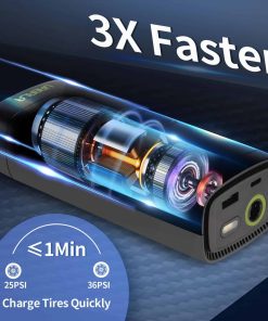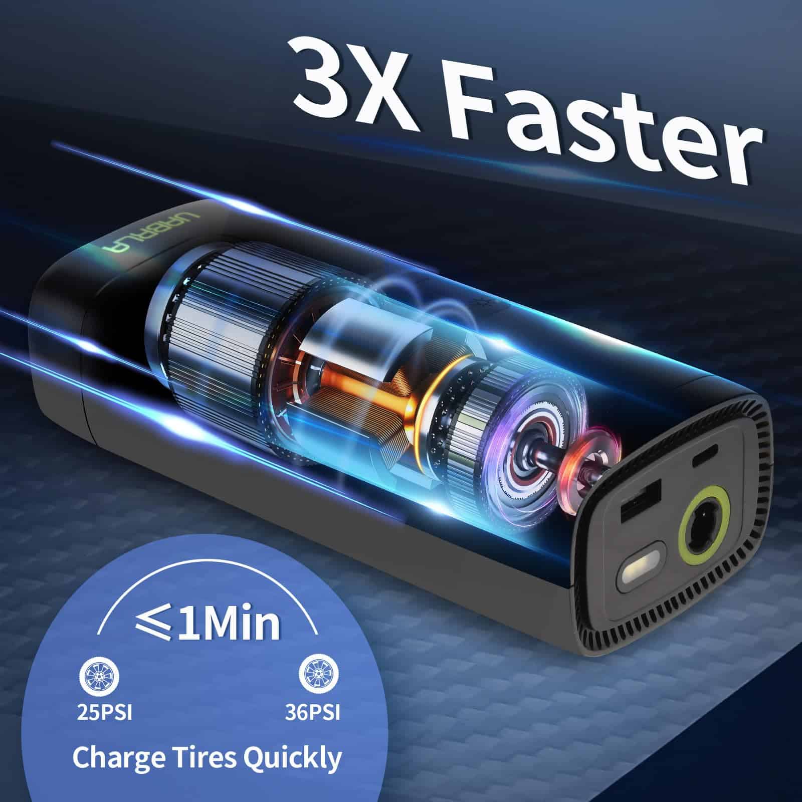 2. INFLADO 3 VECES MÁS RÁPIDO: Con un diseño turbo y equipado con un chip de alto rendimiento, este compresor de aire portátil para neumáticos de automóvil puede proporcionar hasta 150 psi de presión y rellenar un neumático de automóvil 175/70R14 de 0 a 35 psi en menos de 5 minutos. La velocidad es un 30% más rápida que los demás en el mercado.