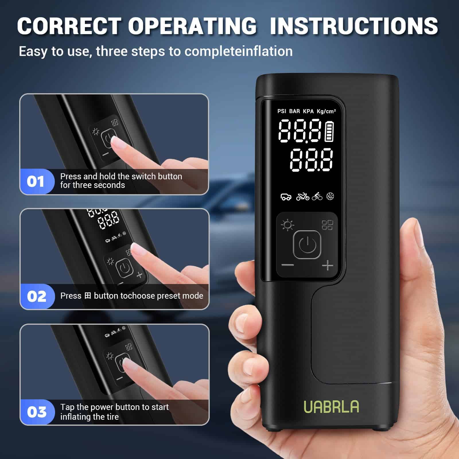 3. 4+1 MODOS INTELIGENTES: El inflador de neumáticos portátil está preestablecido con 4 unidades de presión: PSI, KPA, BAR, KG/CM, y cuatro modos de inflado preestablecidos: bicicleta, motocicleta, automóvil y pelota. El quinto modo personalizado también puede fijar el valor de presión según el objeto inflable, fácil de usar, los principiantes también pueden operarlo fácilmente. Es un producto esencial para la vida diaria y los viajes.
