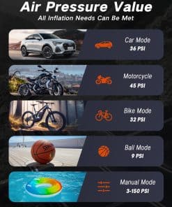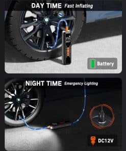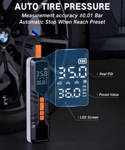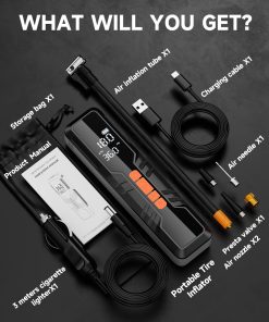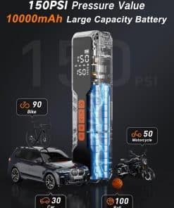 1. 4X Velocidad de inflado rápido: El inflador de neumáticos proporciona una batería de 10000mAh, 120,000R / MN rpm, rellena de 30 a 36 PIS neumáticos en 22″ hasta que se rellena 32 veces. Paro automático completo, configure el modo de inflado, no necesita supervisión durante el inflado. 2. Medición de presión más precisa: La bomba de aire eléctrica para automóvil está equipada con un medidor digital preciso de presión que reduce el problema de la presión de neumáticos inestable e inflado inestable, la bomba de aire le brinda el efecto de inflado más cómodo y rápido. 3. Los nuevos 5 modos de inflado: La bomba de aire para automóvil inalámbrica tiene una presión de aire de 150PSI, 5 modos para elegir con una tecla, utilizando una pequeña bomba de aire para los neumáticos de automóviles, neumáticos de bicicleta de carretera, neumáticos de bicicleta, neumáticos de motocicleta, pelota. Viaje, camping, energía de emergencia esencial y bombas de neumáticos inflables. 4. 2 Métodos rápidos de inflado mejorados: El compresor de aire portátil está equipado con una batería reconocida internacionalmente y 12V DC, 3 horas para cargar completamente, tubo de inflado de aire de alta presión inflable / inflable electrónico, reduciendo el consumo de energía en 4X, facilitando el inflado al viajar, también soporta carga de teléfonos. 5. Inflable de graves y luces LED: El inflador portátil de neumáticos para automóvil puede reducir un 50 % menos de ruido que las bombas inflables ordinarias, equipado con luces LED como iluminación y brillo, se infla por la noche tan rápido como durante el día. Solo 592g. 6. Mini inflador de neumáticos: Bomba de bicicleta recargable en su automóvil como accesorios para automóviles. Los infladores de neumáticos son la elección para hombres/mujeres para Navidad, Día del Padre, Año Nuevo, Cumpleaños, etc.