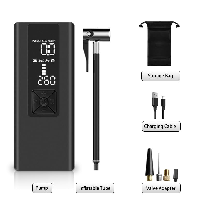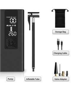 5. Diseño portátil: Este producto es inalámbrico, lo que hace que su diseño sea compacto y fácil de llevar. Viene con una bolsa para un fácil almacenamiento en coches, portabicicletas o mochilas y asegura su conveniencia para inflar durante los viajes o en casa. El inflador de neumáticos inalámbrico incluye múltiples accesorios y es un producto imprescindible para conductores, ciclistas y aventureros.