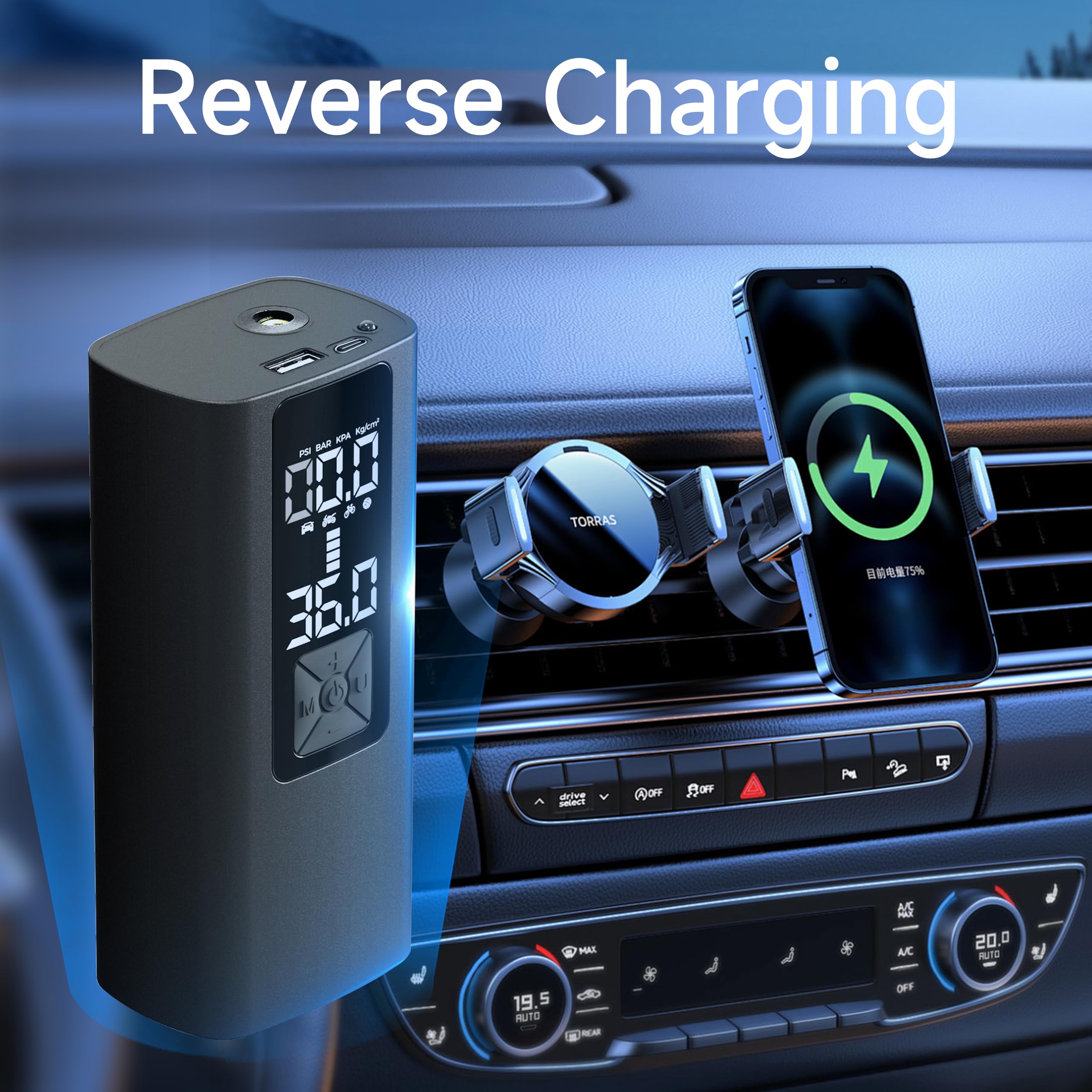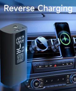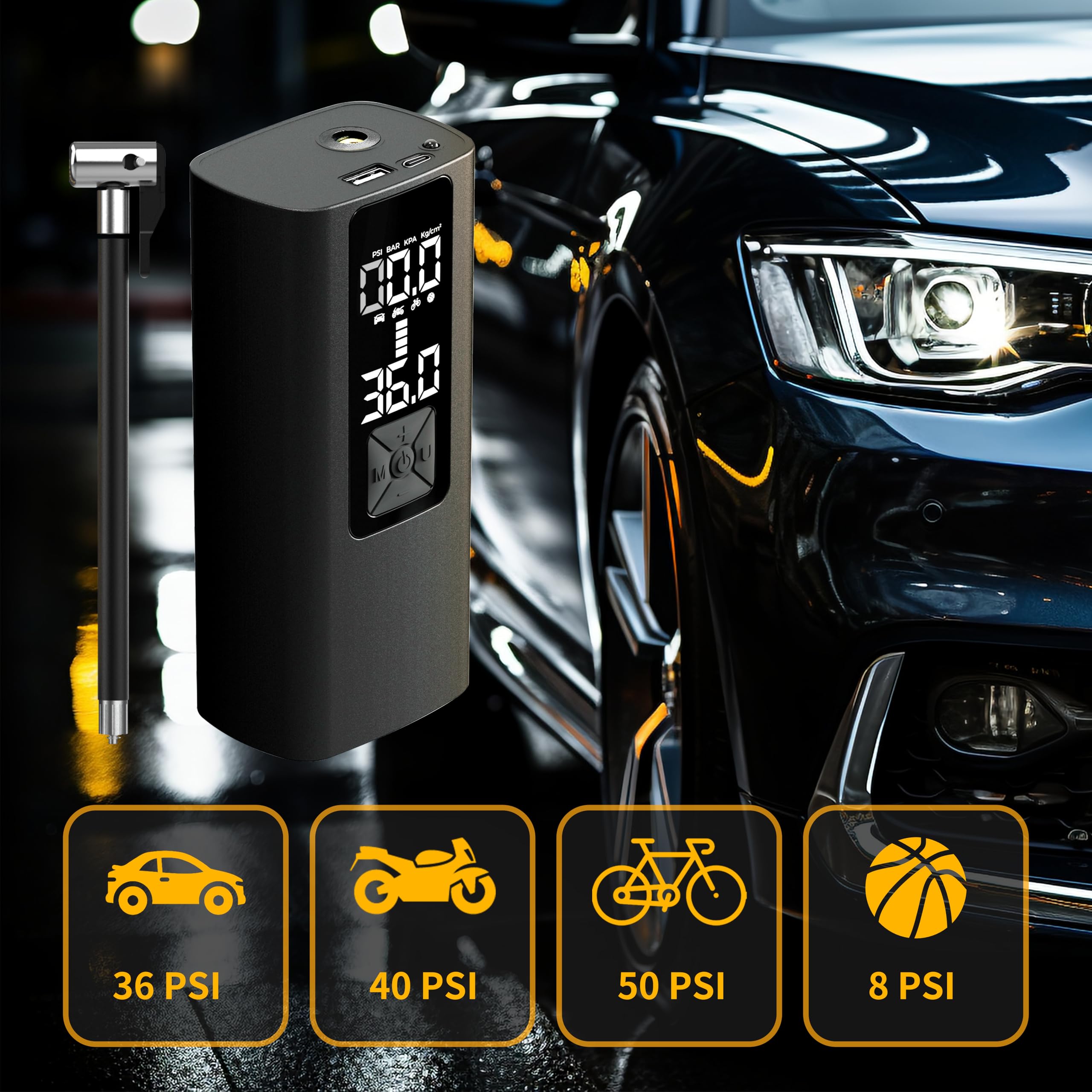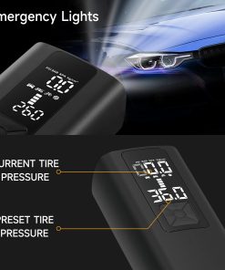 4. Práctico y multifuncional: Este inflador de neumáticos inalámbrico también cuenta con un puerto de carga USB-C y USB-A, convirtiéndolo funcionalmente en un banco de energía para su teléfono móvil, tableta, ordenador portátil y más. Además, una luz de emergencia LED en la parte superior lo hace útil para emergencias en carretera e inflado de neumáticos nocturno.