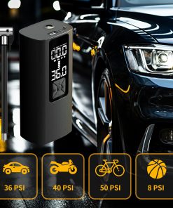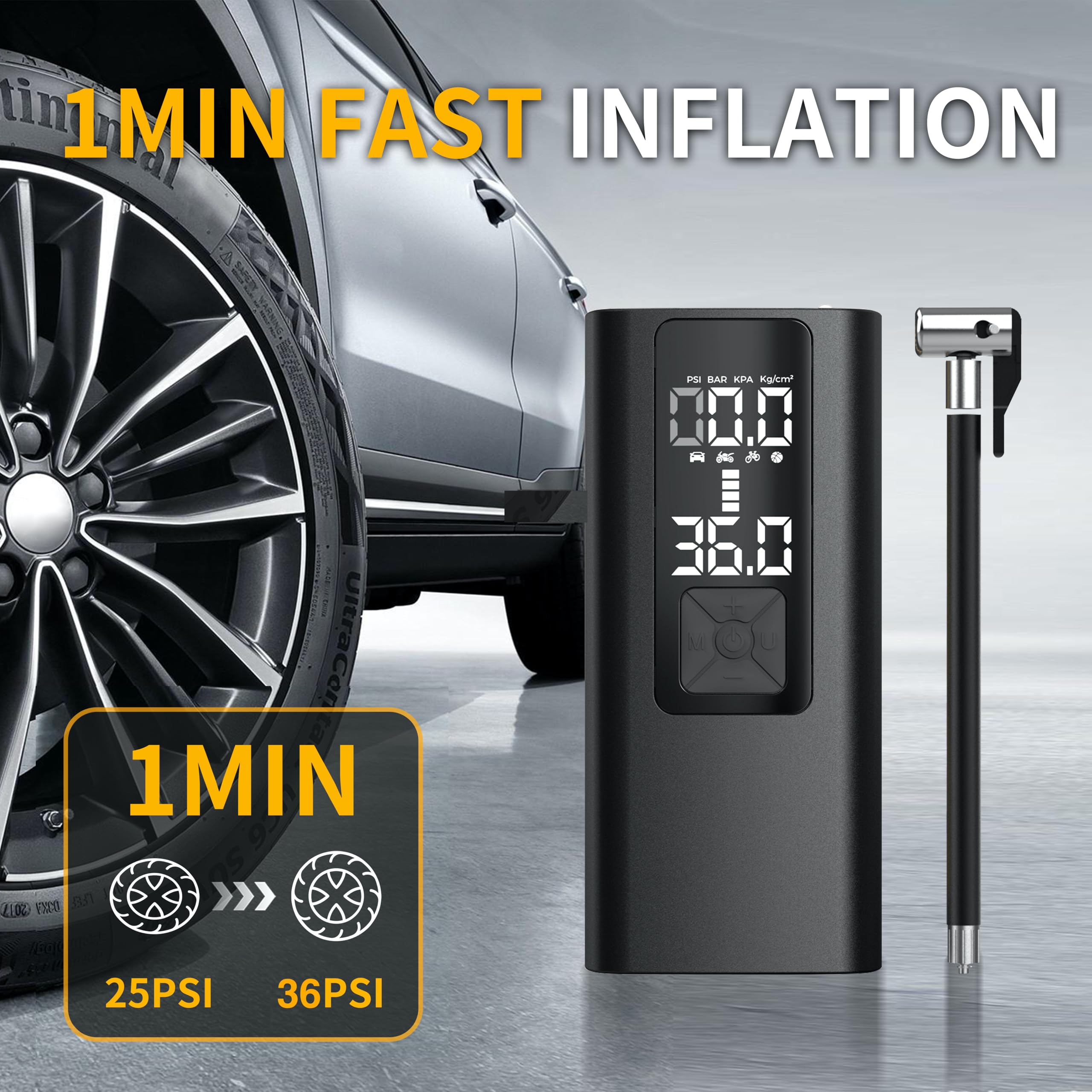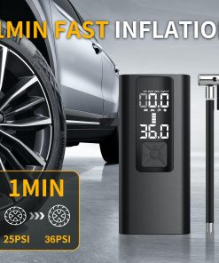 1. Inflación de neumáticos 4 veces más rápida: Este inflador de neumáticos portátil está equipado con un compresor de aire de 15 cilindros, aumentando la potencia del compresor en un 50% y permitiendo una velocidad de inflado de aire cuatro veces más rápida que las bombas de aire para coches contemporáneas. Alcanza una tasa de flujo de 30L/Min. Este producto puede inflar los neumáticos de su coche de 25 a 36 psi (tamaño de los neumáticos 245/60/R18) en 1 minuto y llenar todo el neumático en 5 minutos.