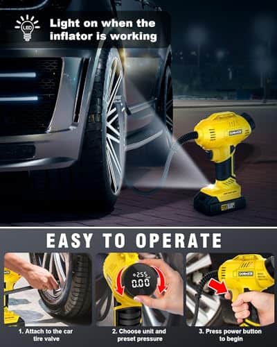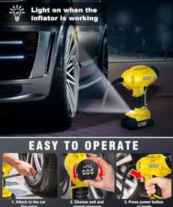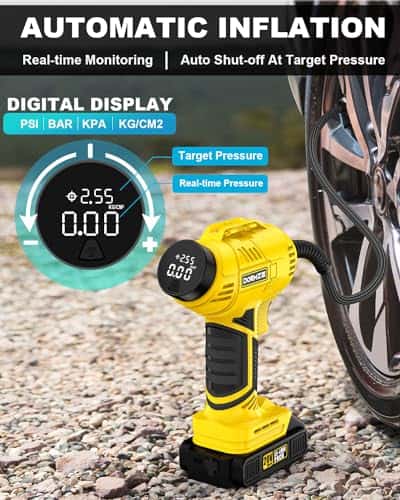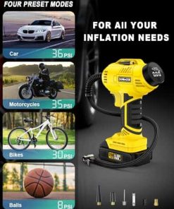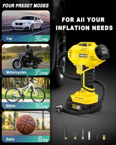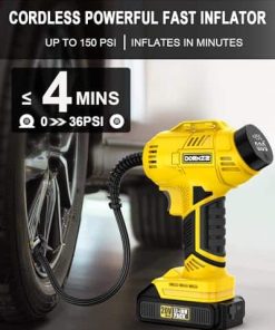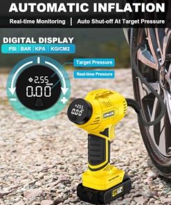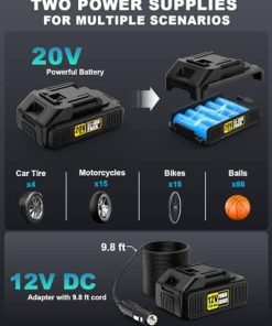 Disfrute de la libertad de inflado sin cables con nuestro inflador de aire ST189CD. Alimentado por una potente batería de iones de litio recargable de 20V, ofrece un inflado rápido y eficiente de neumáticos. Con un cilindro y engranaje robustos, opera a una velocidad de inflado 2 veces más rápida y un 30% más de potencia que las bombas regulares. Con una presión máxima de 150 psi, puede funcionar continuamente durante 20 minutos, manejando fácilmente inflaciones de cuatro neumáticos a la vez. Ajuste su presión de aire deseada fácilmente girando la perilla de forma más simple y rápida que al presionar botones. Nuestro compresor de aire se apagará automáticamente al alcanzar la presión objetivo, eliminando preocupaciones de sobreinflado. El claro medidor de presión digital admite 4 interruptores de unidad (BAR, KPA, PSI, KG/CM2), garantizando un monitoreo fácil y preciso con una precisión de +/- 1 PSI para una inflación precisa en todo momento. El inflador de neumáticos ST189CD no solo cuenta con una batería de iones de litio recargable de 20V para mayor comodidad sin cables, sino que también incluye un adaptador de corriente de 12V para coche, brindando una solución de doble potencia para sus viajes. Con el fiable adaptador de CC de 12V como fuente de energía alternativa, no tiene que preocuparse por que la batería se agote durante su viaje. Con una presión máxima de 150 PSI, nuestro inflador de neumáticos DORMZIE es su compañero confiable y versátil para diversas necesidades de inflado. Ya sea su coche, motocicleta, bicicleta, equipos deportivos como balones o incluso globos decorativos, esta bomba de aire de mano portátil está diseñada para manejar todo. Tenga en cuenta que no es adecuado para neumáticos de camiones grandes. El inflador de aire para neumáticos presenta un diseño portátil y compacto que se puede almacenar fácilmente en su coche. Su compra incluye un inflador de neumáticos inalámbrico, un paquete de batería de iones de litio de 20V, un adaptador de corriente de 12V para coche, un cargador de batería, 6 boquillas, un manual de usuario y una bolsa de herramientas para un almacenamiento conveniente.