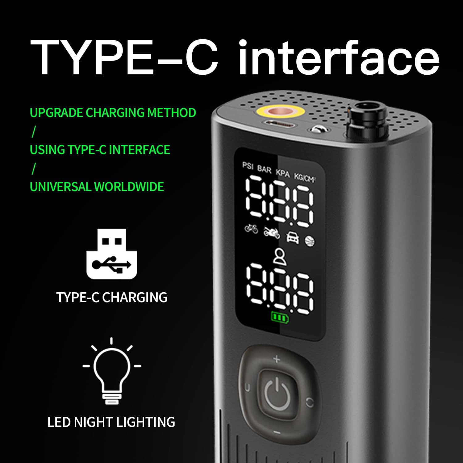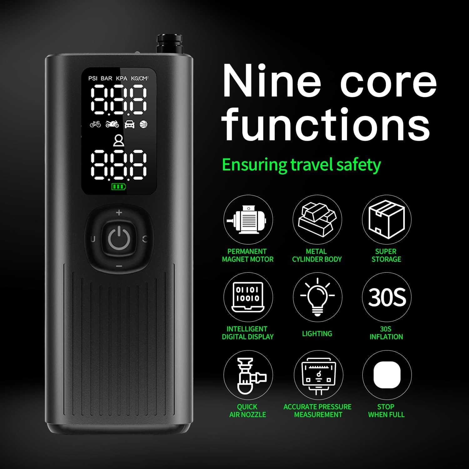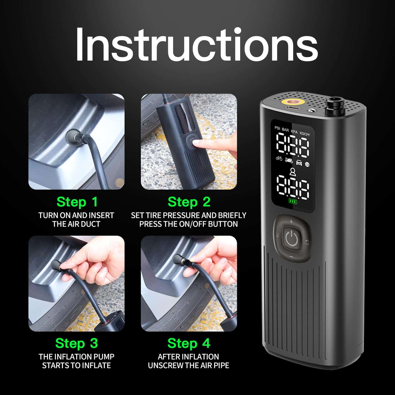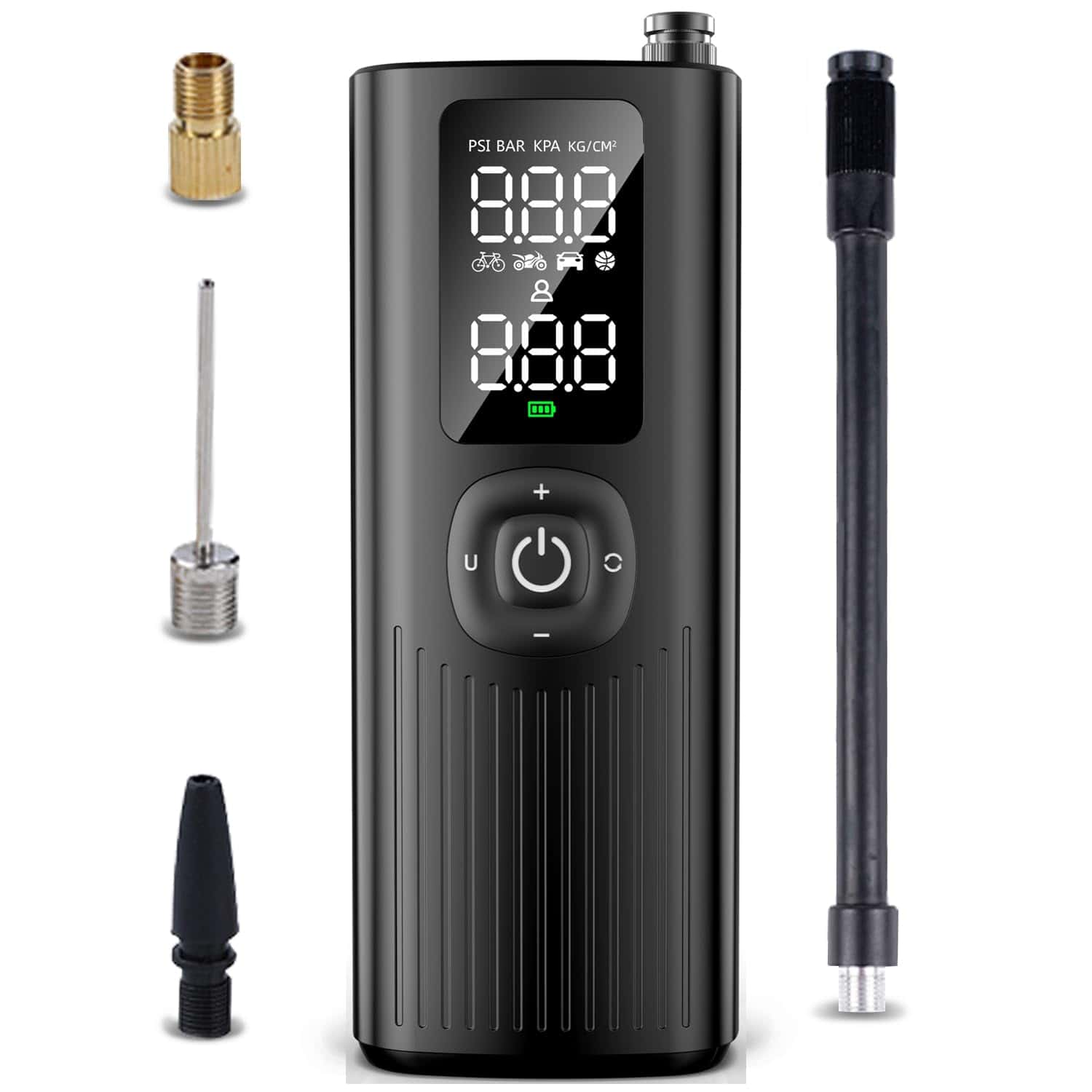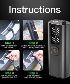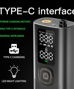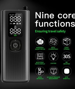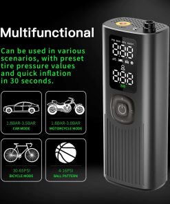 Compresor de aire portátil sin cables para coches, motos y bicicletas. Se inflan rápidamente tus neumáticos en minutos. Pequeño y compacto, cabe en la guantera o maletero. Selecciona la presión deseada con los botones + y -. Conecta la manguera de aire y presiona el botón central para arrancar, se apagará automáticamente al alcanzar la presión correcta. Cambia fácilmente entre las unidades de presión PSI, kPa, BAR y KG/CM con un solo clic. Incluye 3 accesorios y manguera de aire que se almacenan en el compresor. Empaquetado en una caja de regalo. Listo para usar cuando sea necesario.