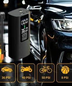 4. Práctico y multifuncional: Este inflador de neumáticos inalámbrico también cuenta con un puerto de carga USB-C y USB-A, convirtiéndolo funcionalmente en un banco de energía para su teléfono móvil, tableta, computadora portátil y más. Además, una luz de emergencia LED en la parte superior lo hace útil para emergencias en carretera e inflado de neumáticos nocturno. Tiene una manguera de 40 centímetros. de longitud con boquilla giratoria de 360 grados para facilitar su uso en cualquier lugar.