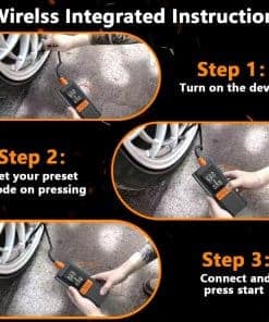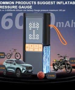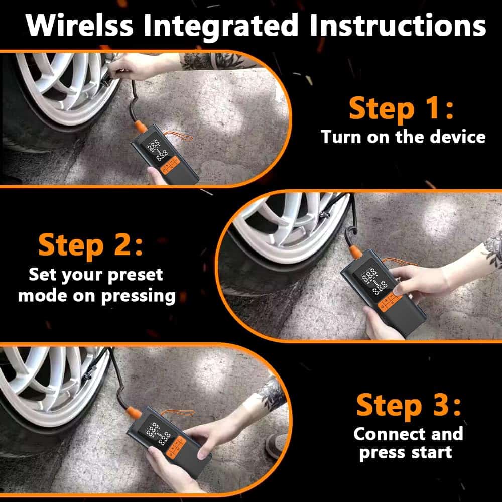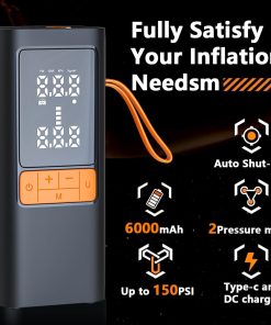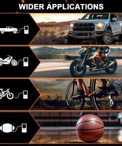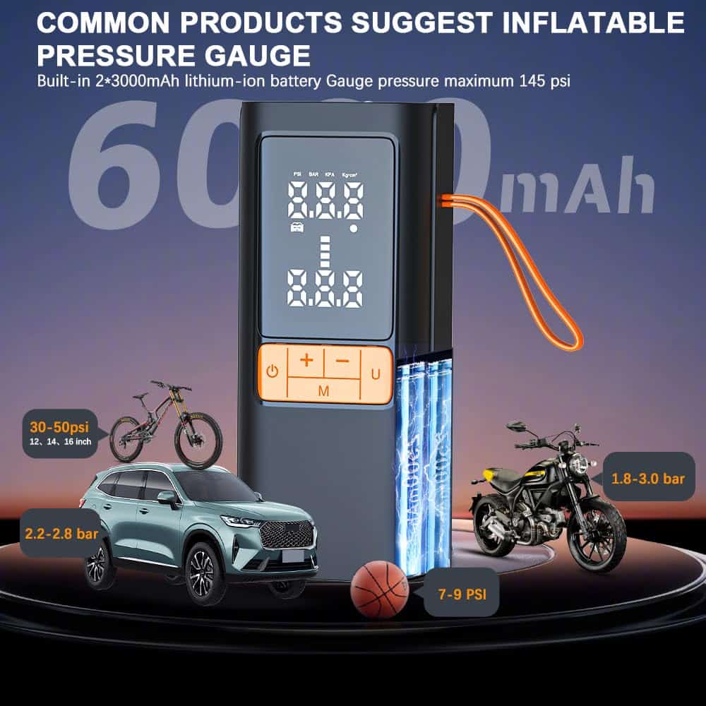3. Apagado automático para mayor seguridad: El compresor de aire para neumáticos está diseñado con una función de apagado automático que evita la sobreflación deteniendo la bomba de aire cuando se alcanza la presión preestablecida. Con solo presionar, el inflador de neumáticos inalámbrico inflará fácilmente neumáticos de coche, neumáticos de moto, neumáticos de bicicleta, pelotas y más. Asegurando un uso seguro tanto para neumáticos de coche como neumáticos de bicicleta.
